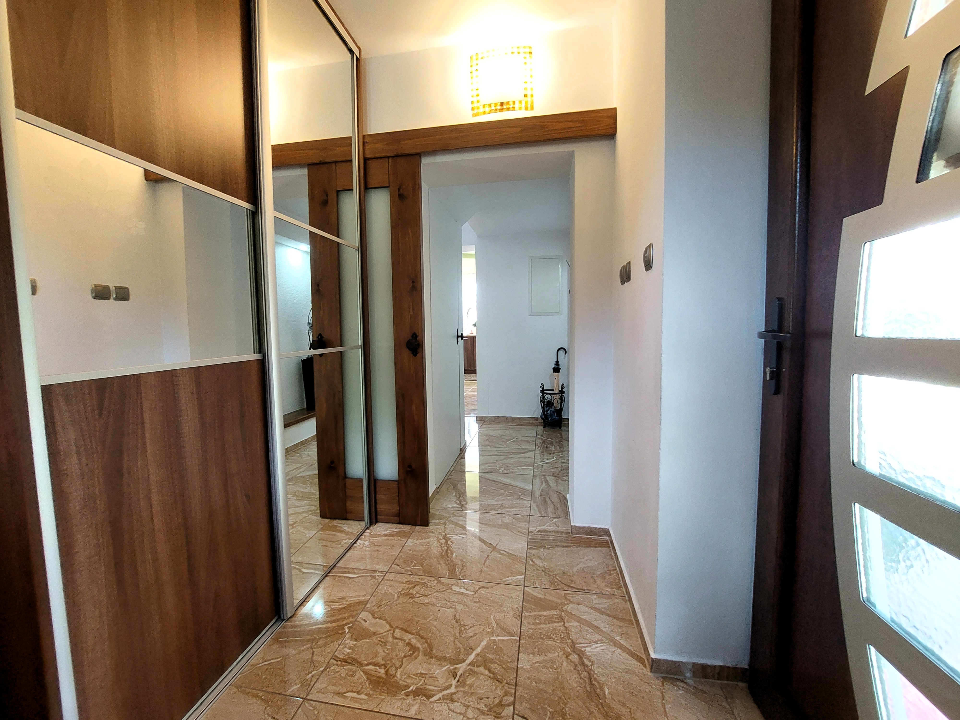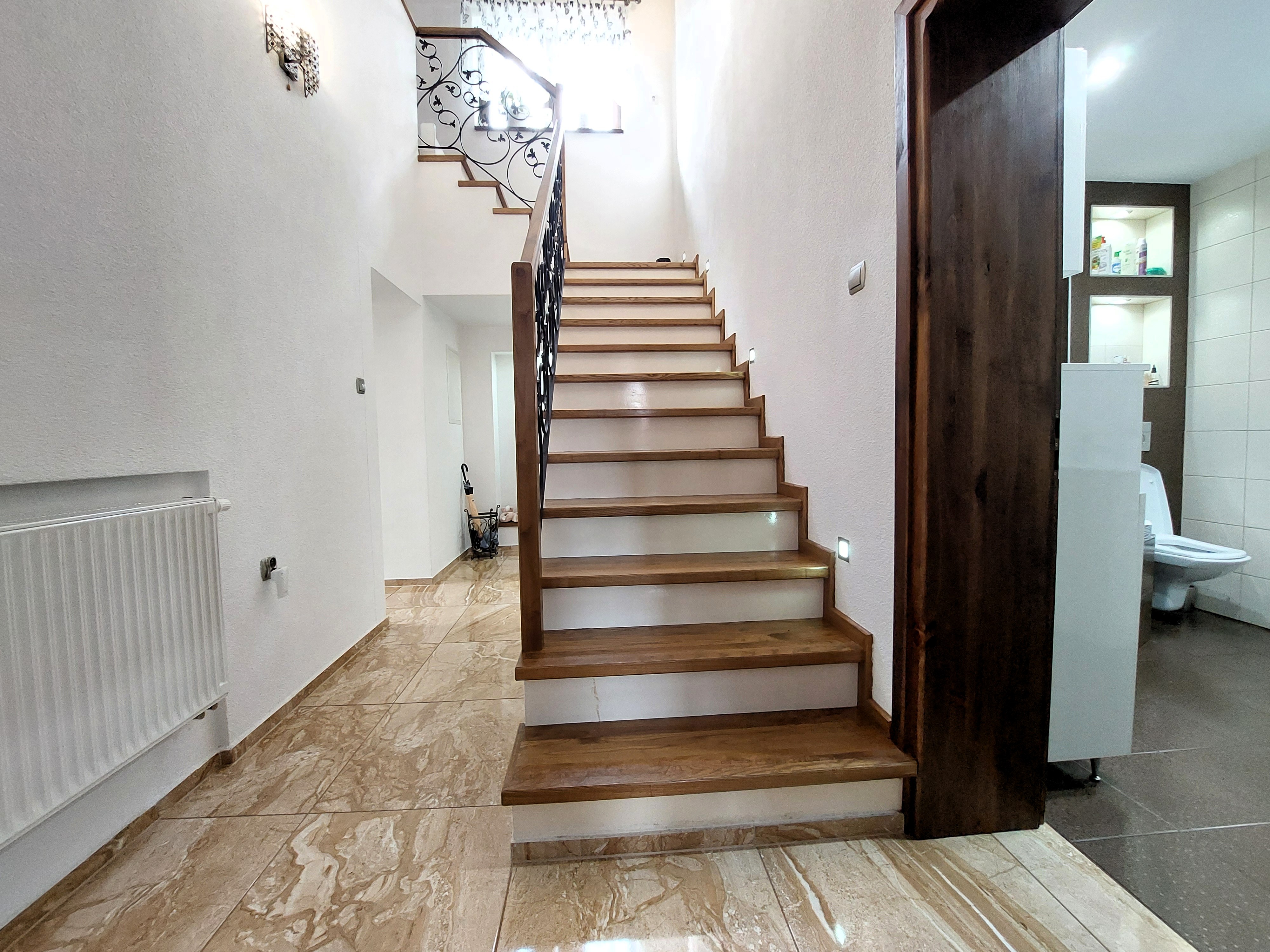 Na prízemie sa vchádza zo zádveria do vstupnej chodby, ktorá postupne vedie celým prvým podlažím. Z chodby prechádza plynule vstup do spoločenského srdca domu – obývacej izby s výstupom na veľkú krytú terasu (40 m2), ktorá susedí s prakticky a vkusne usporiadanou kuchyňouBohatú účelnosť kuchyne predstavuje na mieru zhotovená linka v tvare písmena L so všetkými potrebnými vstavanými spotrebičmi a jedálenskou časťou.  Na prízemí sa nachádza aj toaleta s umývadlom, vaňou a práčkou, ďalej tu nájdeme vstup do hlavnej spálne s murovaným šatníkom a taktiež vstup do suterénu kde nájdeme sklad a kotolňu. O teplo domova sa v sychravých obdobiach stará špičková a dômyselne premyslená technológia.