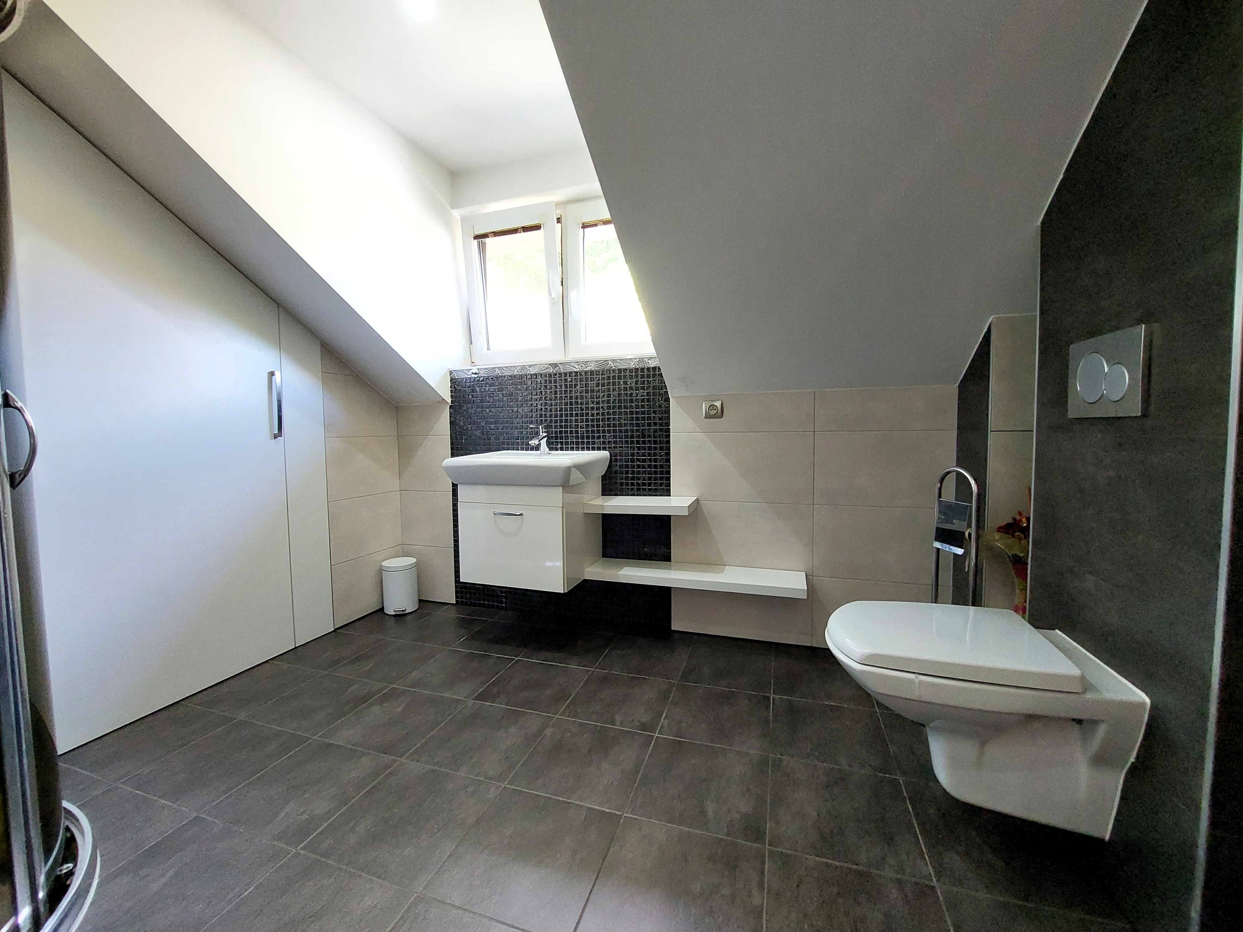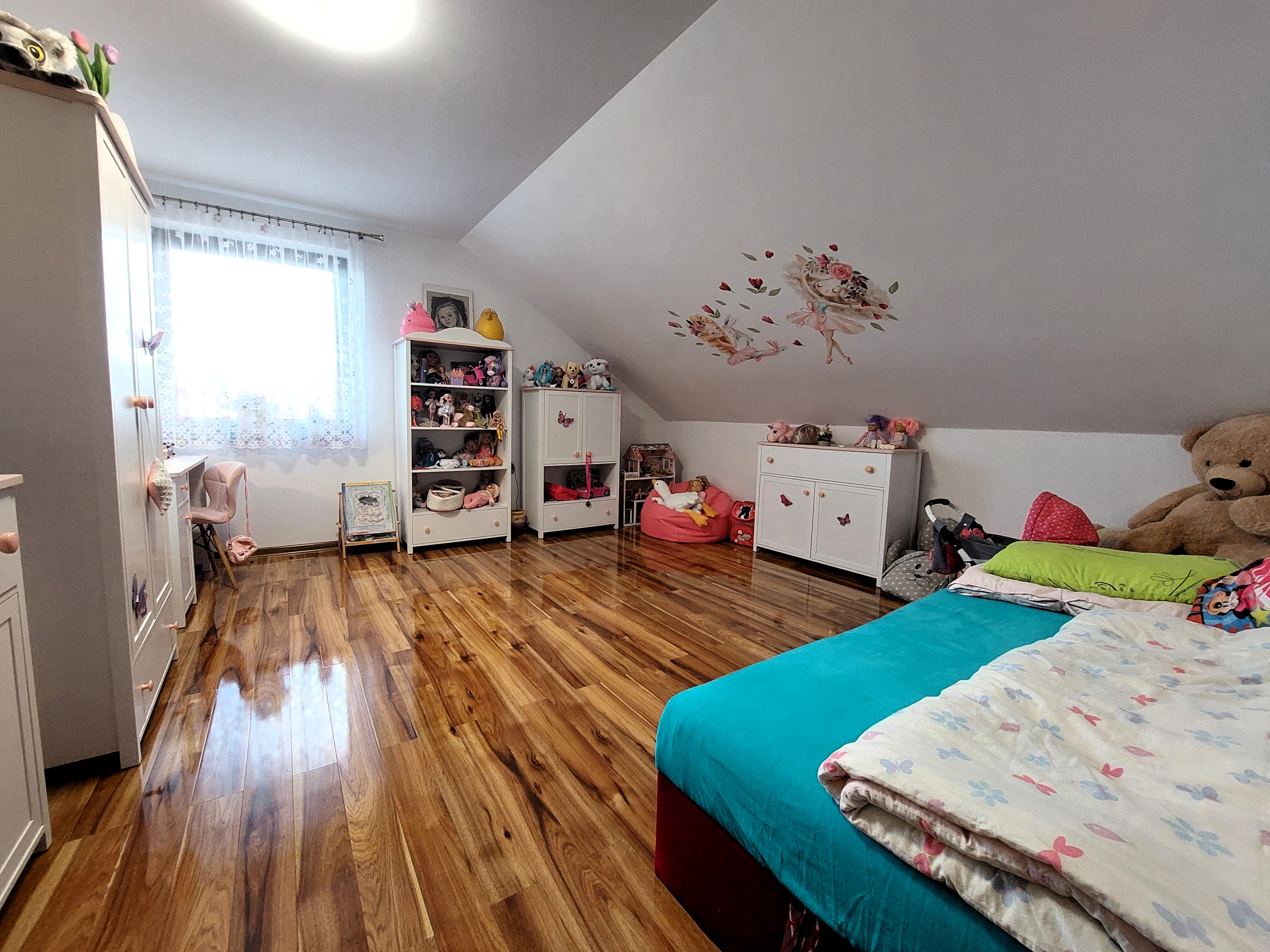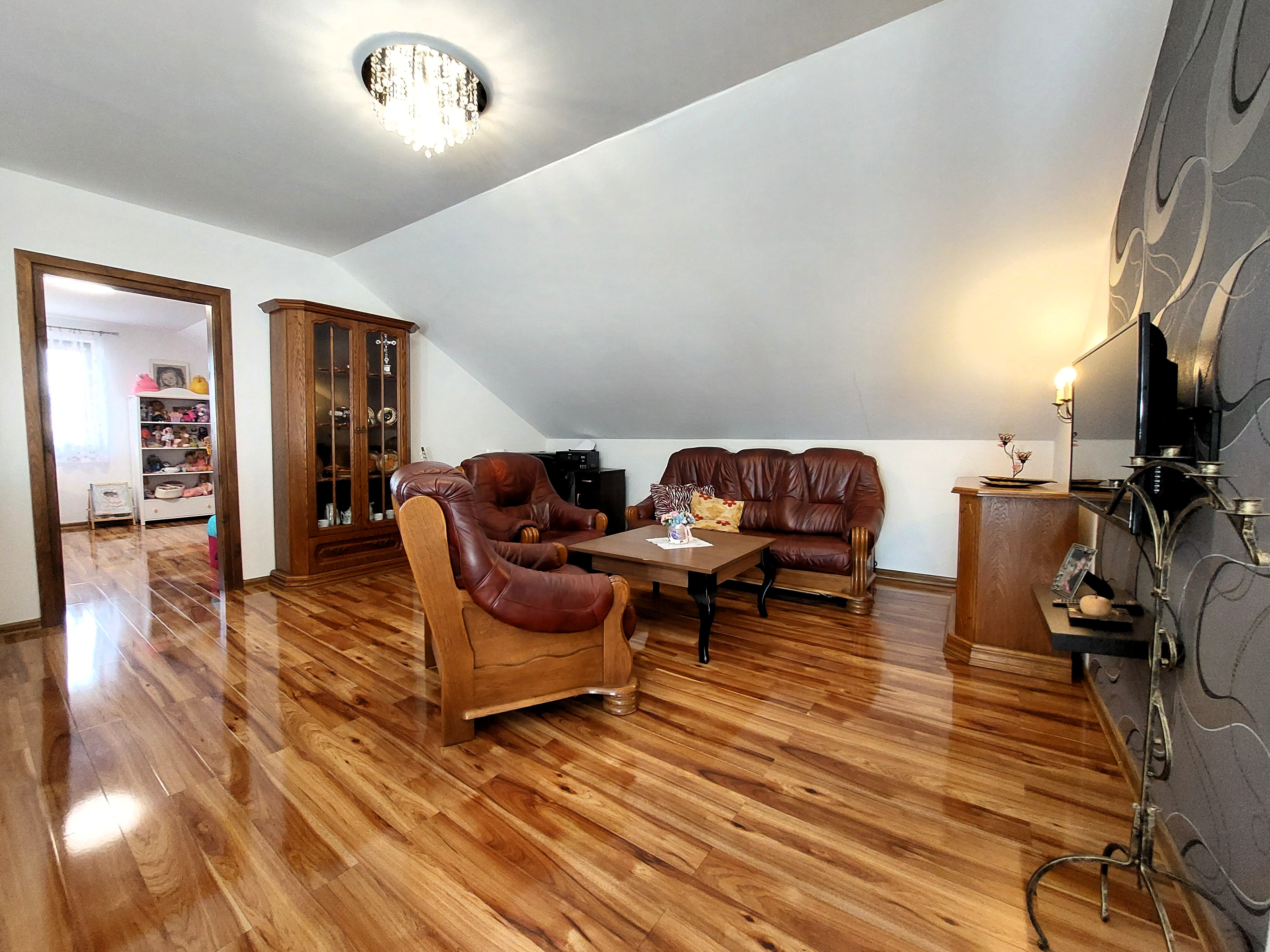 S interiérom domu ladiace schodisko vedie na poschodie, kde sa nachádzajú 3 miestnosti so širokou možnosťou využitia. Ďalej sa tu nachádza samostatný sklad, kúpeľňa s umývadlom, sprchovým kútom a toaletou. Dve z troch izieb ponúkajú výhľady do záhrady a okolitú krajinu. Z chodby na poschodí je výlez na povalu, ktorá poskytuje ďalší úložný priestor.