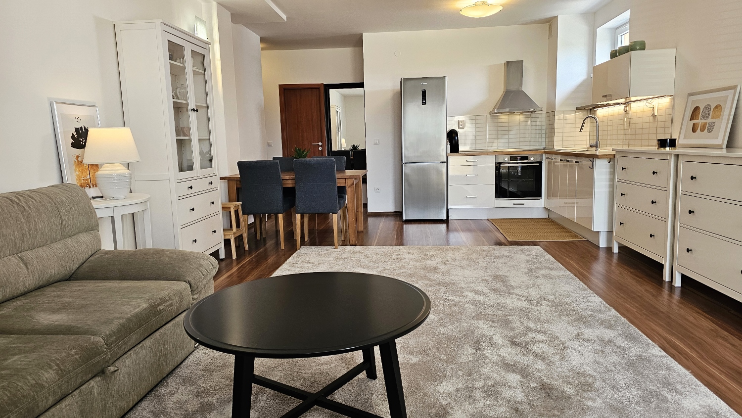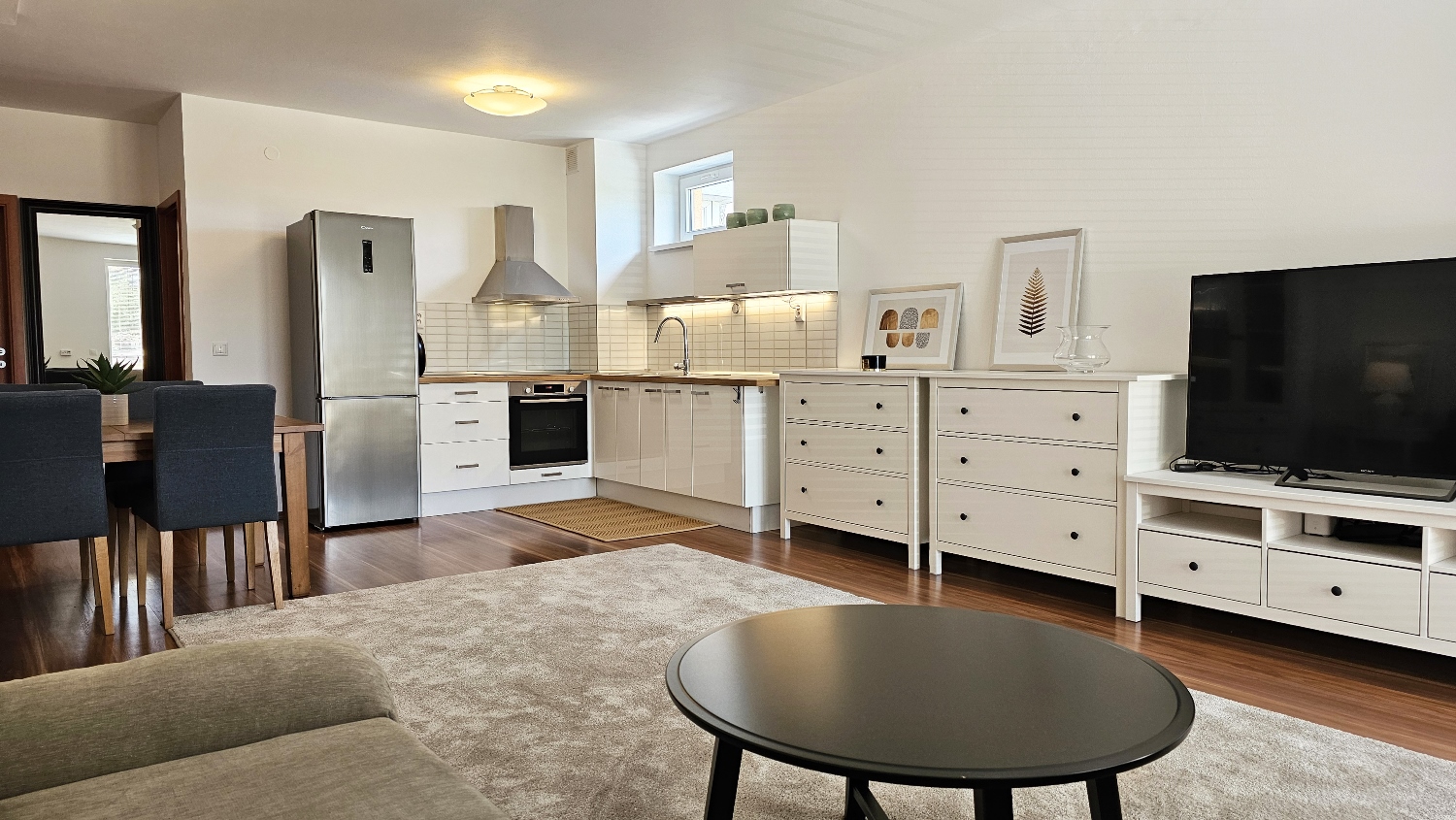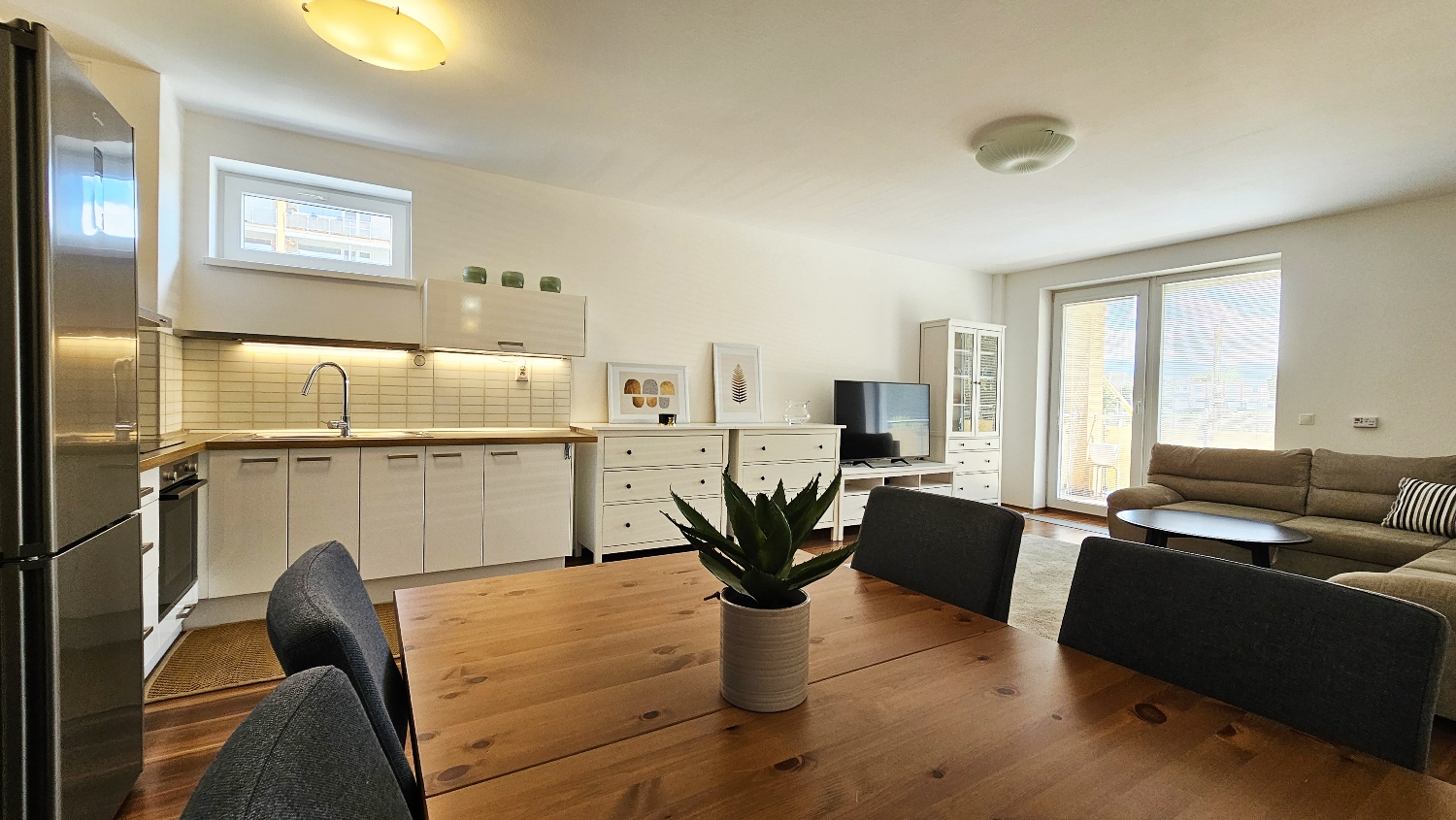 Sedacia súprava, jedálenské sedenie pre 4 osoby, veľkoplošný televízor Sony, manželská posteľ, kuchynská linka so spotrebičmi Bosch a Candy. Stačí si doniesť osobné veci a môžete začať bývať.