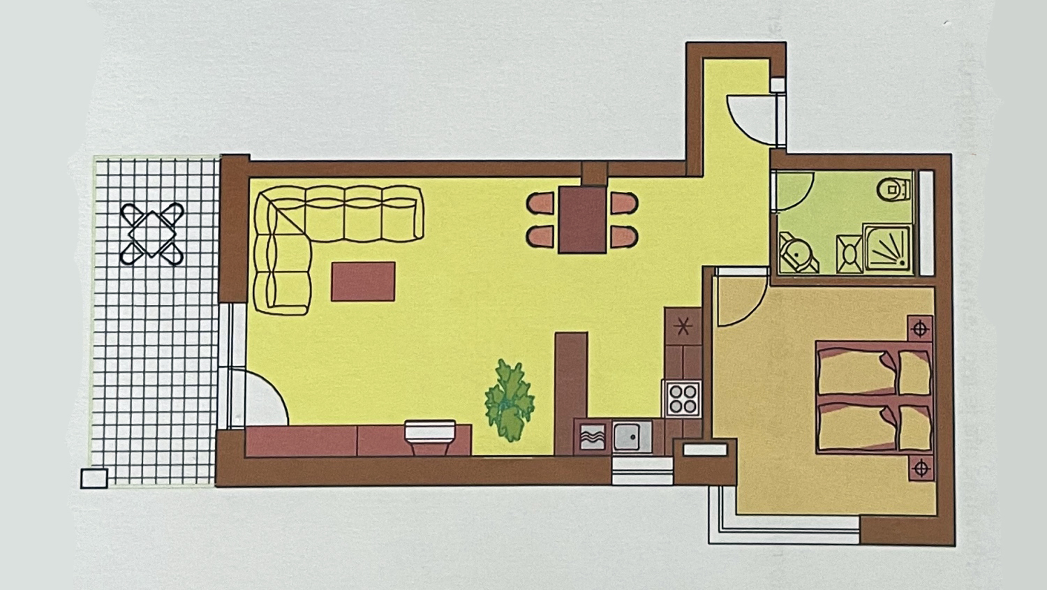Otvorený priestor obývačky s kuchyňou a jedálenským sedením /32,1 m²/ s výstupom na veľkorysý balkón, spálňa /12,6 m²/ so šatníkovou skriňou, kúpeľňa so sprchovacím kútom, toaletou a práčkou, predsieň. Murovaná pivnica v suteréne.