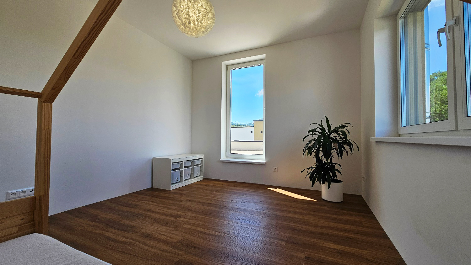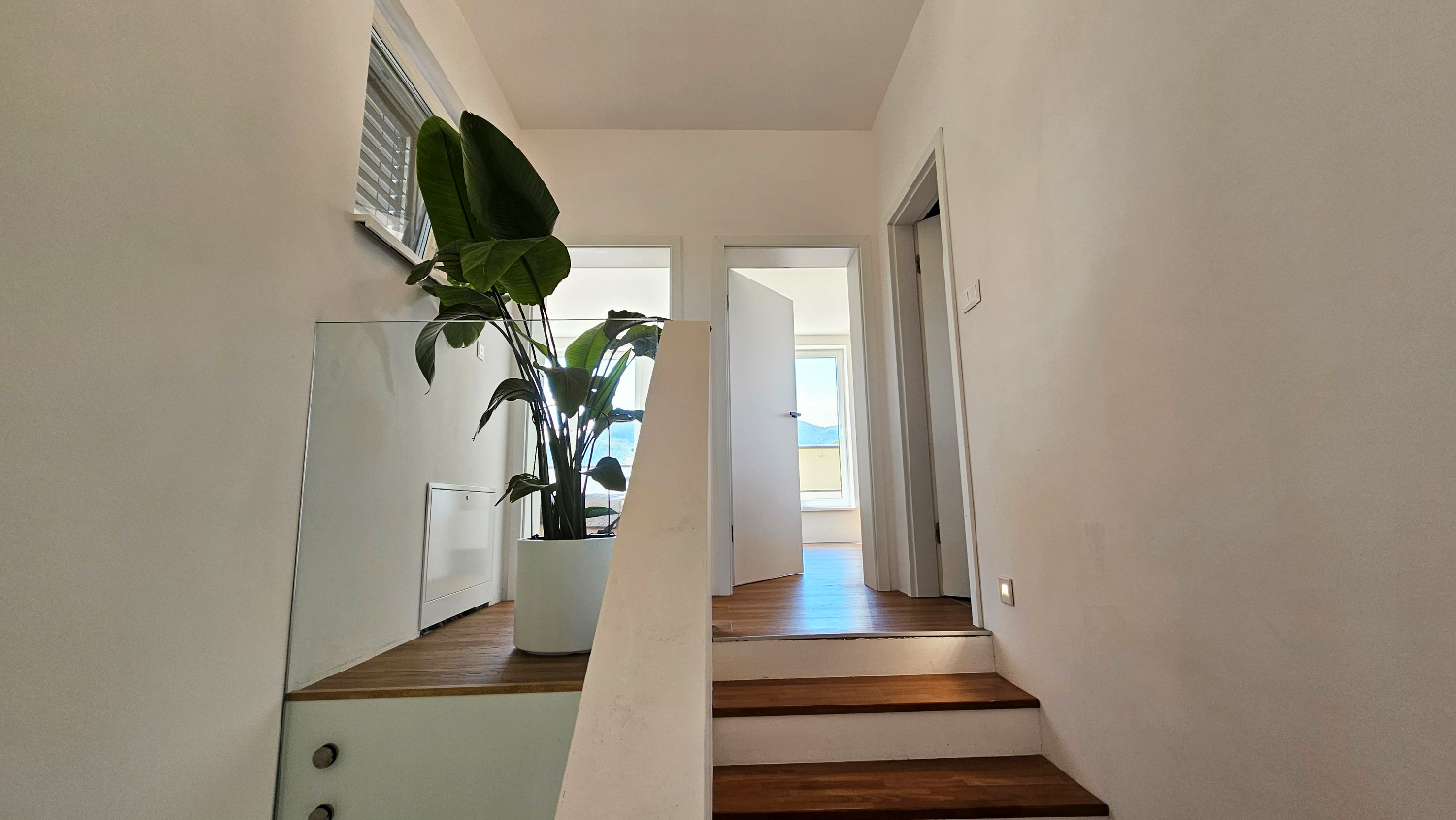 POSCHODIE ponúka dve izby s vítanou flexibilitou /17,60 + 14,74 m²/ - detská ríša, hosťovský únik, pracovný azyl. Kúpeľňa, chodby, schody do prízemia a príprava na terasu, z ktorej sa výhľady strácajú v diaľke.