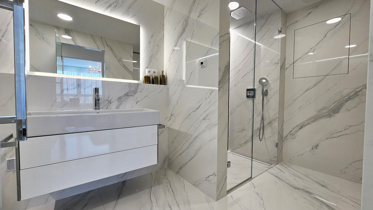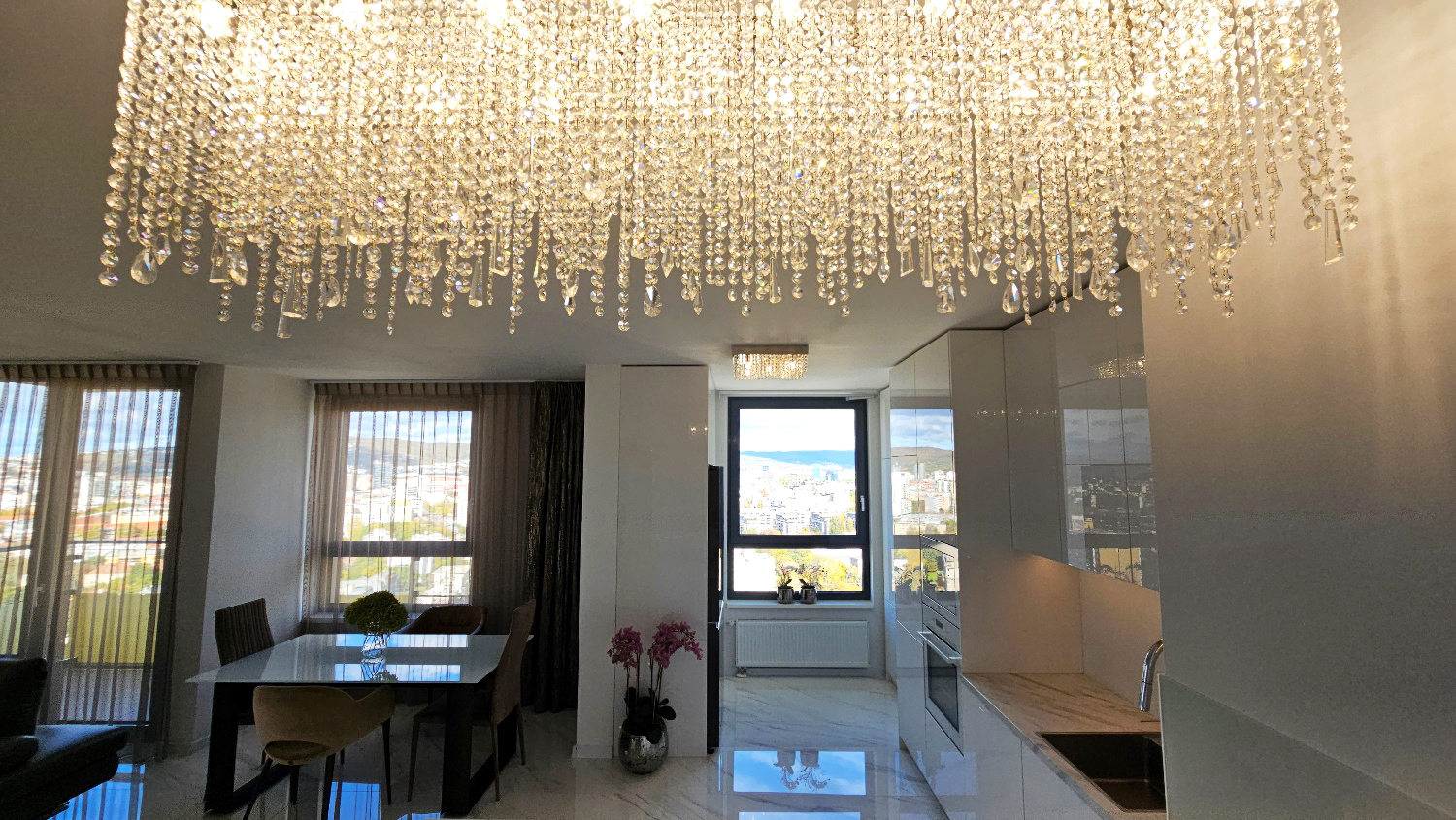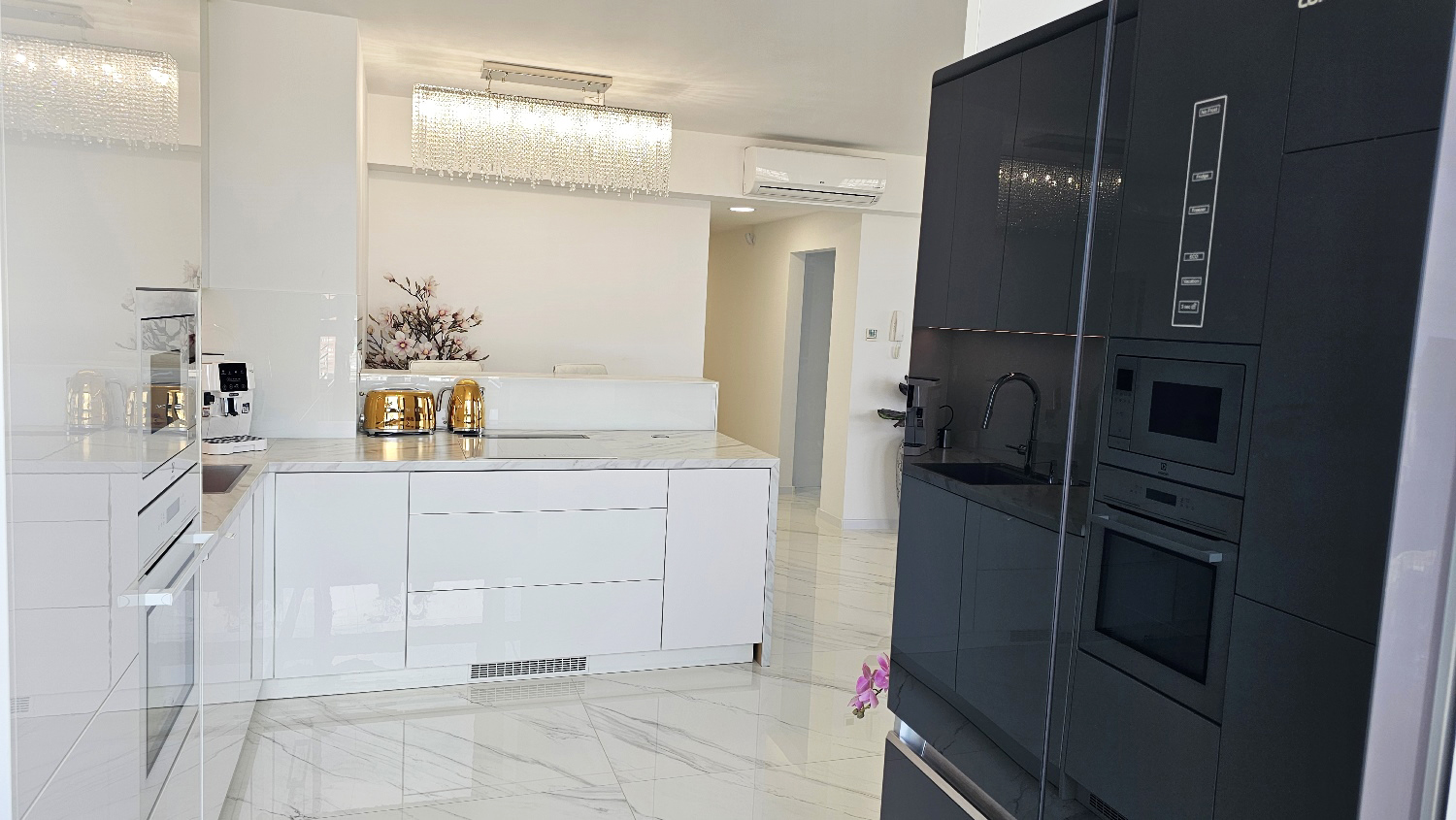 Novostavba z roku 2018. Španielska veľkoformátová dlažba v celom byte, krištáľové lustre s reguláciou, kožená sedacia súprava. Kompletne vybavená kuchynská linka so spotrebičmi Electrolux (mikrovlnná rúra, rúra na pečenie, umývačka riadu, sklokeramická varná doska s odsávačom zabudovaným do pracovnej dosky), americká 4-dverová chladnička. Hliníkové okná s trojitým zasklením a vetraním, motorizované žalúzie ovládané na diaľku. Radiátorové vykurovanie s individuálnou reguláciou, elektrické podlahové kúrenie v kúpeľni, klimatizácia v každej izbe.