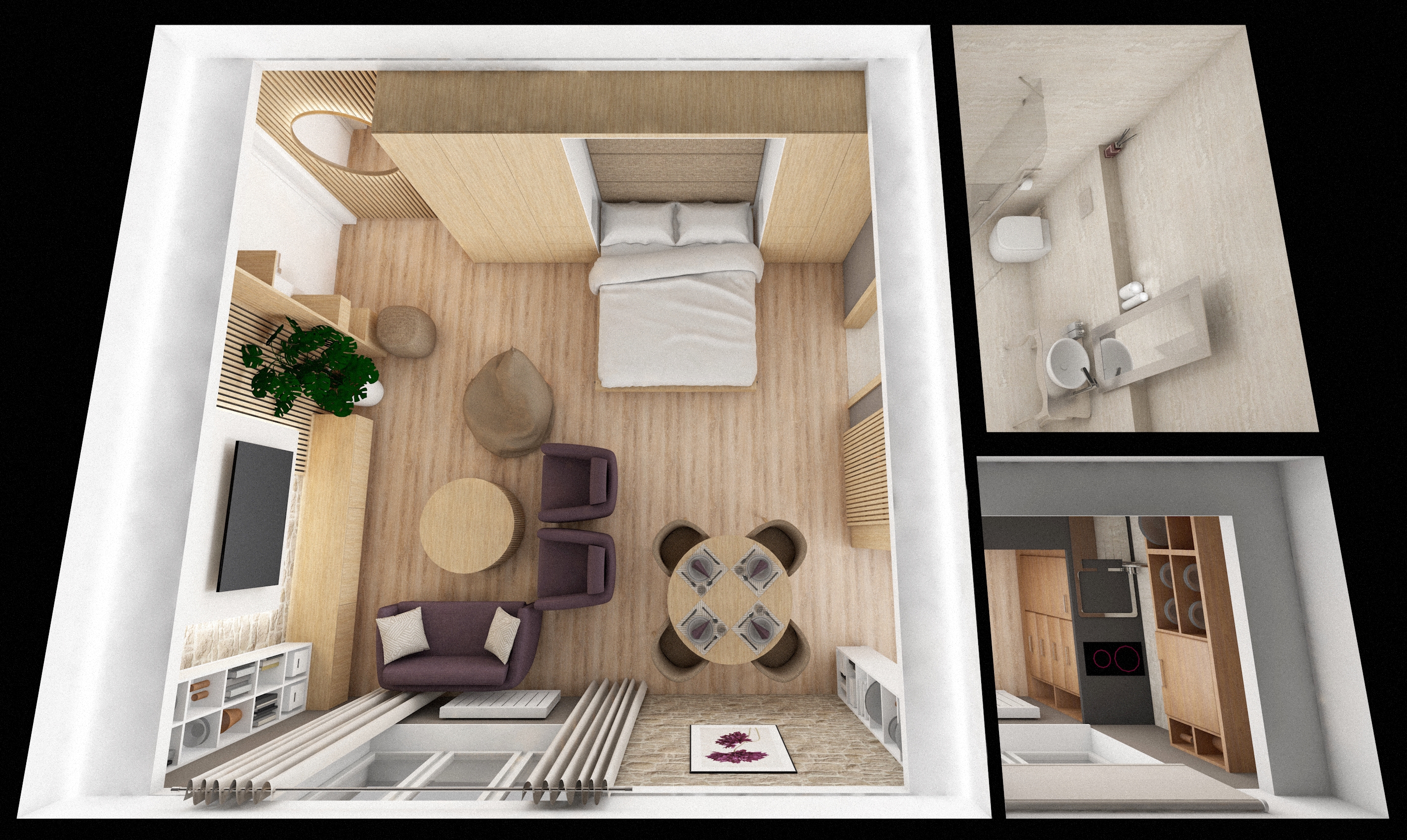 • Kancelária s kuchynkou a kúpeľňou (projekt na 1-izb. apartmán): 38,20 m²