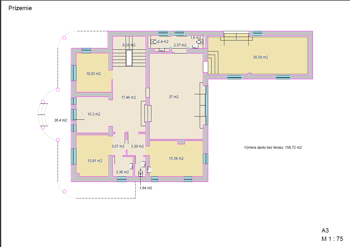 Ponúkame Vám na prenájom moderné priestory skolaudované už ako "zdravotnícke zariadenie" v kompletne novozrekoštruovanej VILE "BIELY DOM", ktorá sa nachádza úplnom centre Rajeckých Teplíc. Vila sa rozprestiera na pozemku o celkovej výmere 2.029 m2 a pozostáva z 3-podlaží o celkovej podlahovej ploche 392 m2 + terasy. Suterén má výmeru 135,81 m2, prízemie má 158,72 m2 a nadzemné podlažie 97,40 m2 + 58 m2 (terasy). Pôdorysy jednotlivých podlaží nájdete pri fotografiach.