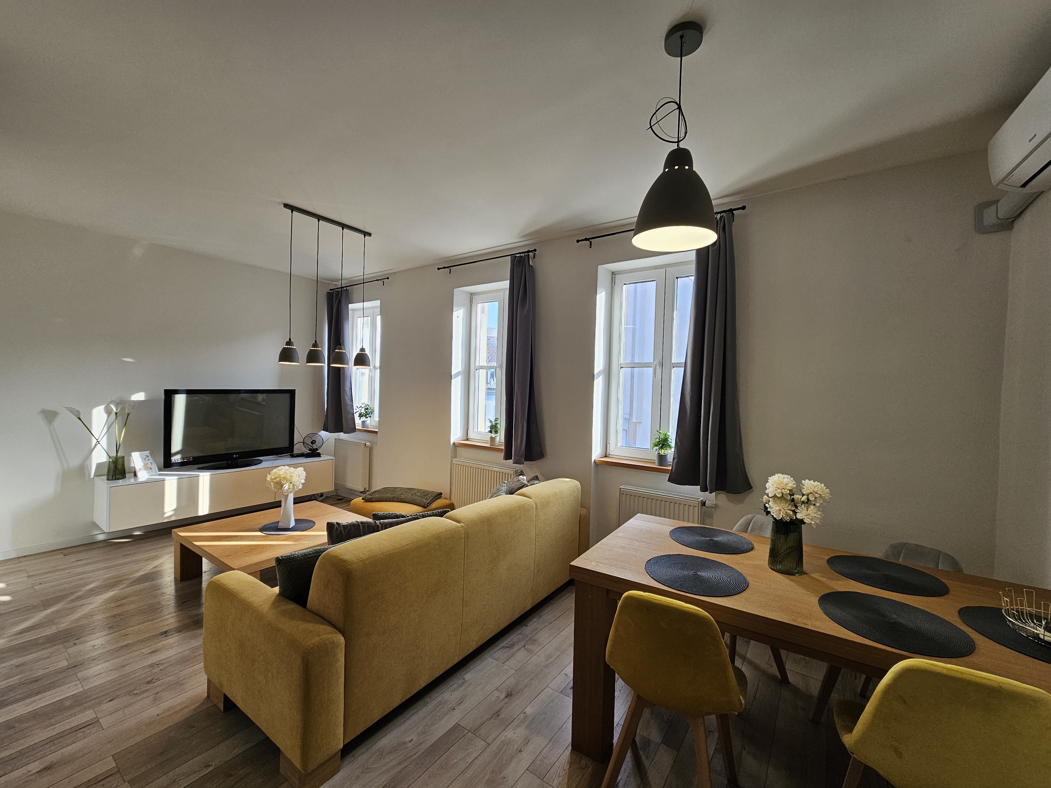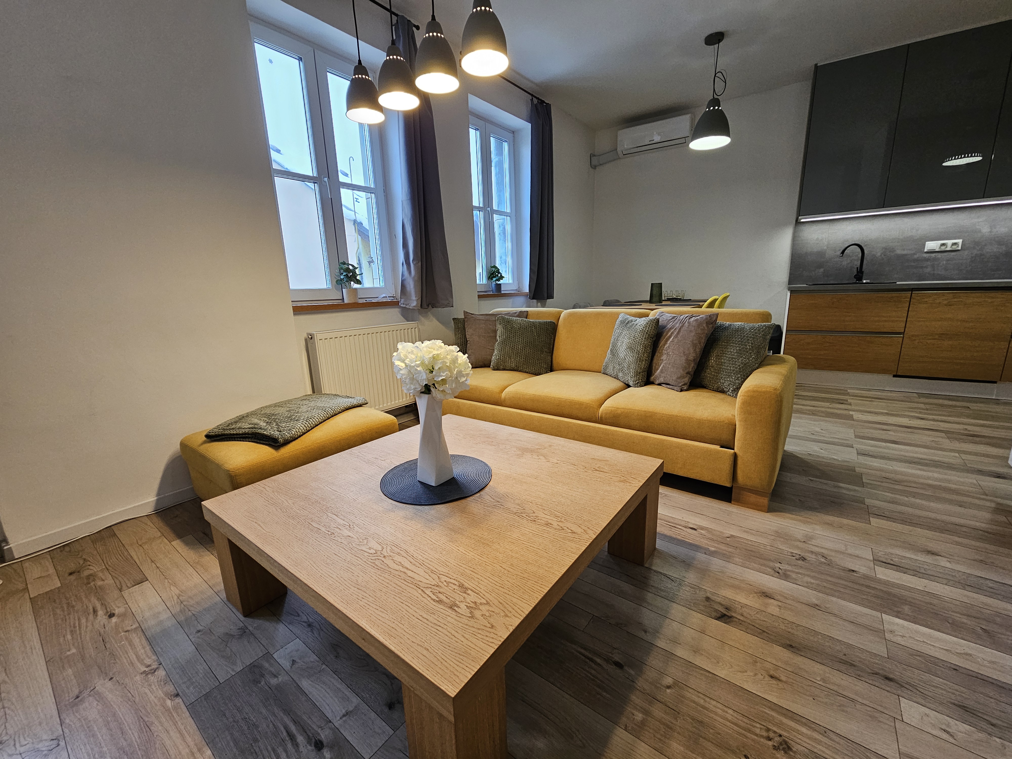 Srdcom bytu je obývacia izba prepojená s kuchyňou v ktorej nechýba klimatizácia. Plne vybavená kuchynská linka so vstavanými spotrebičmi (rúra, mikrovlnná rúra, chladnička s mrazničkou, indukčná varná doska) a jedálenský kút sú ideálne na spoločné chvíle. Obývacia časť so sedačkou, televízorom a konferenčným stolíkom vás pozýva k oddychu a príjemným večerom.