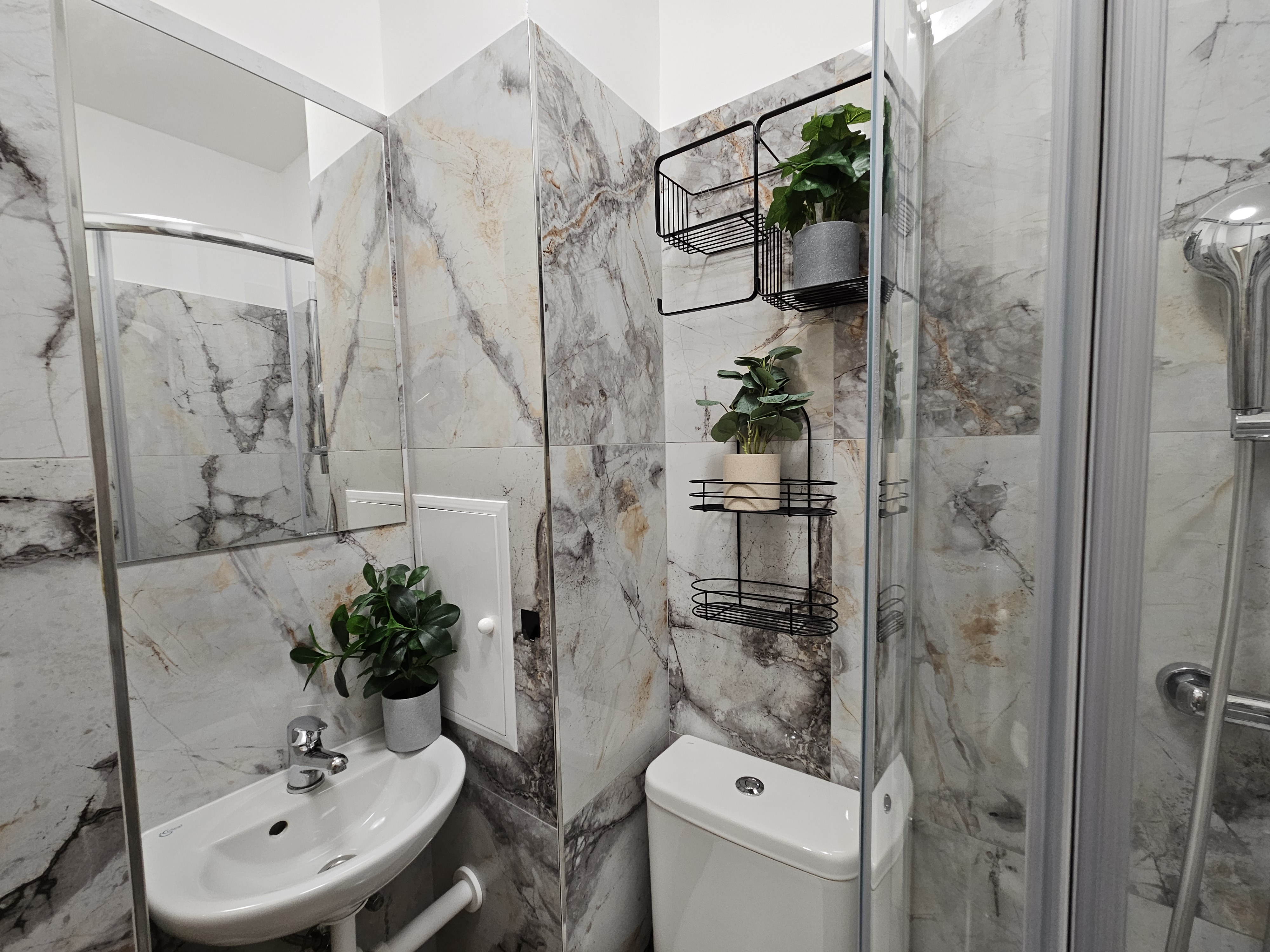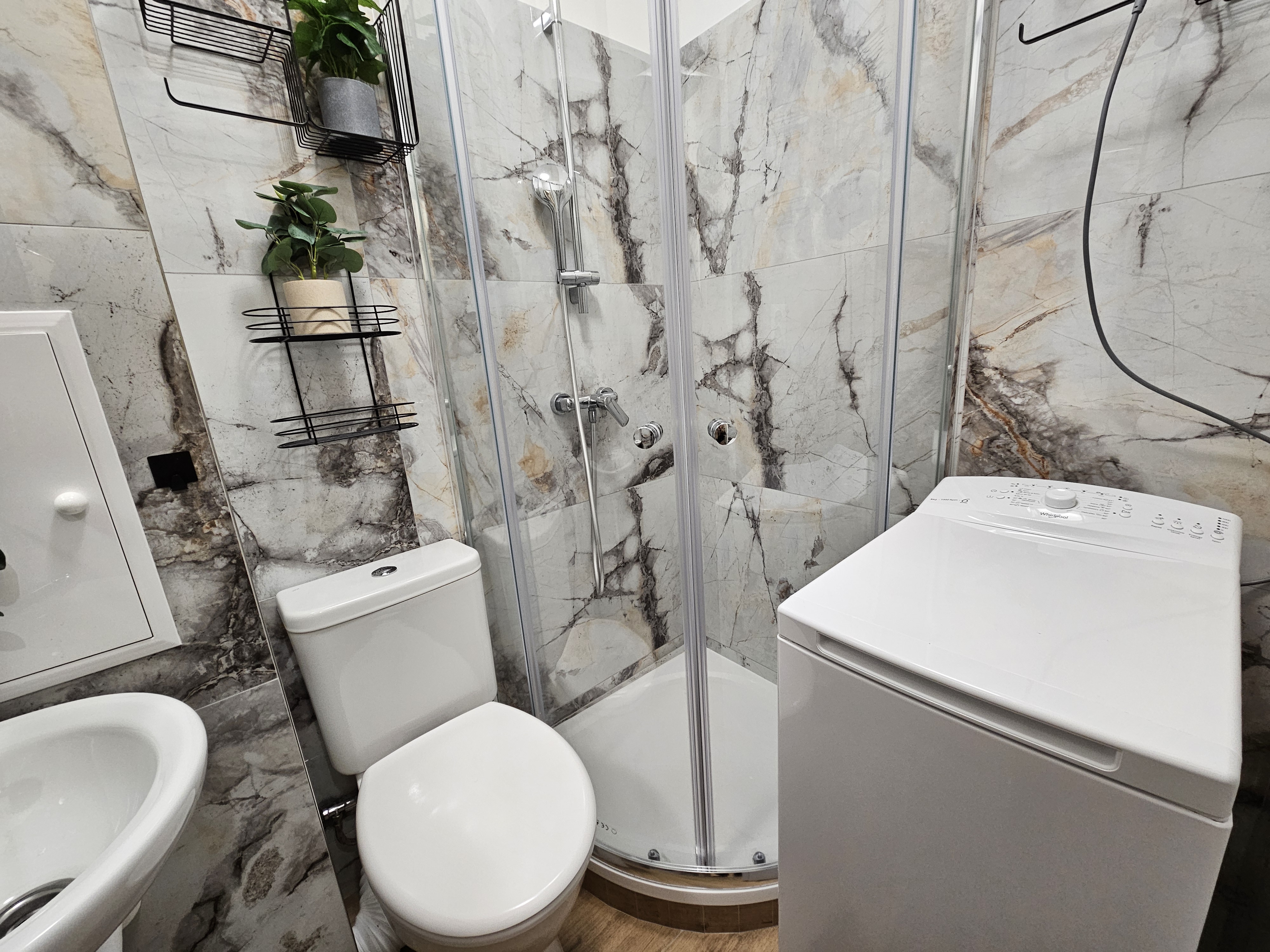 Kúpeľňa je vybavená sprchovým kútom, WC, umývadlom so zrkadlom a automatickou práčkou.