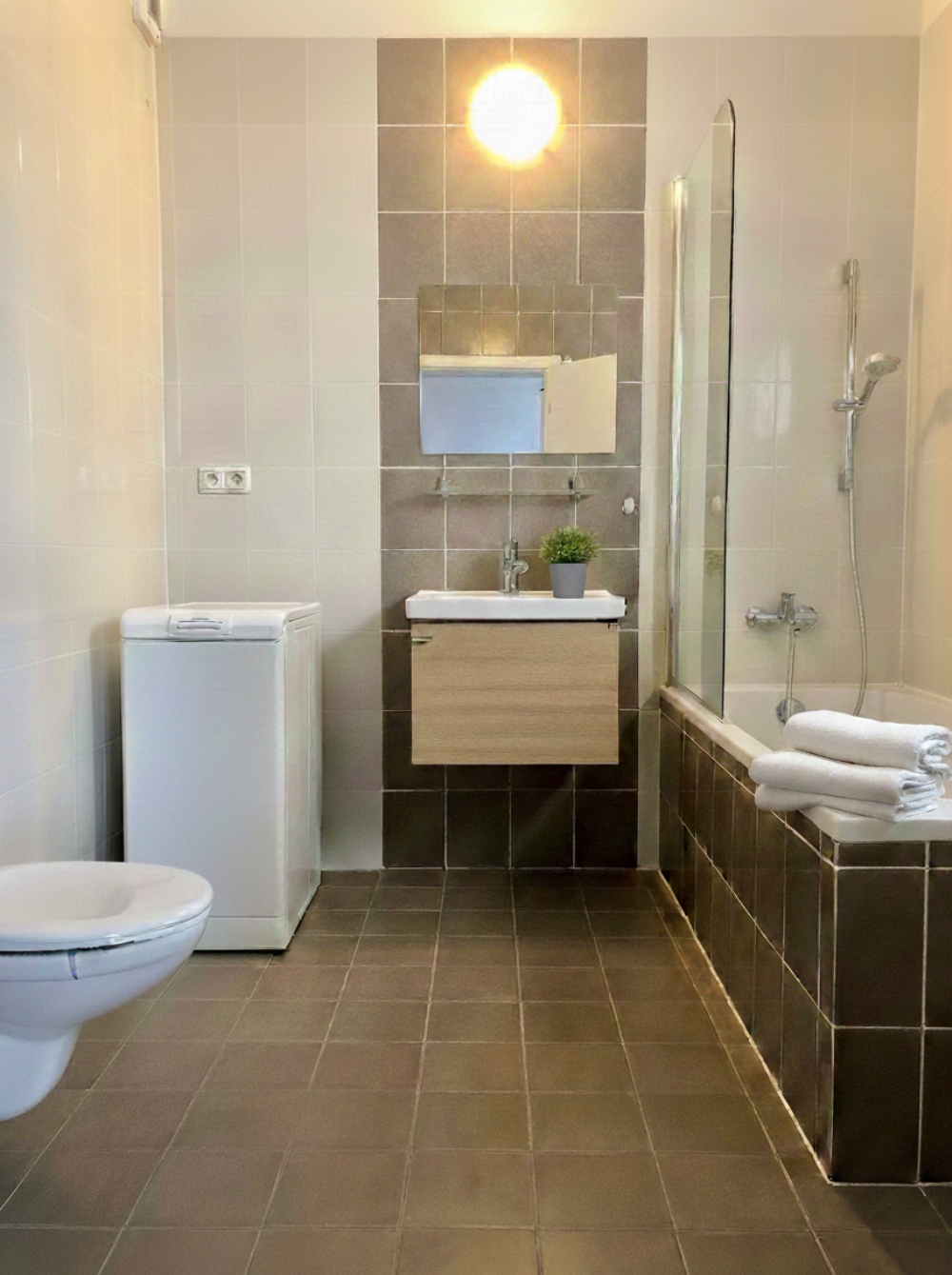 Vykurovanie vykurovacími registrami v podlahe, radiátormi a vyhrievacími rebríkmi. Kuchyňa s umývačkou riadu + chladnička s mrazničkou. Práčka, televízor. Video vrátnik, požiarny hlásič. Internet a televízia pripravené.