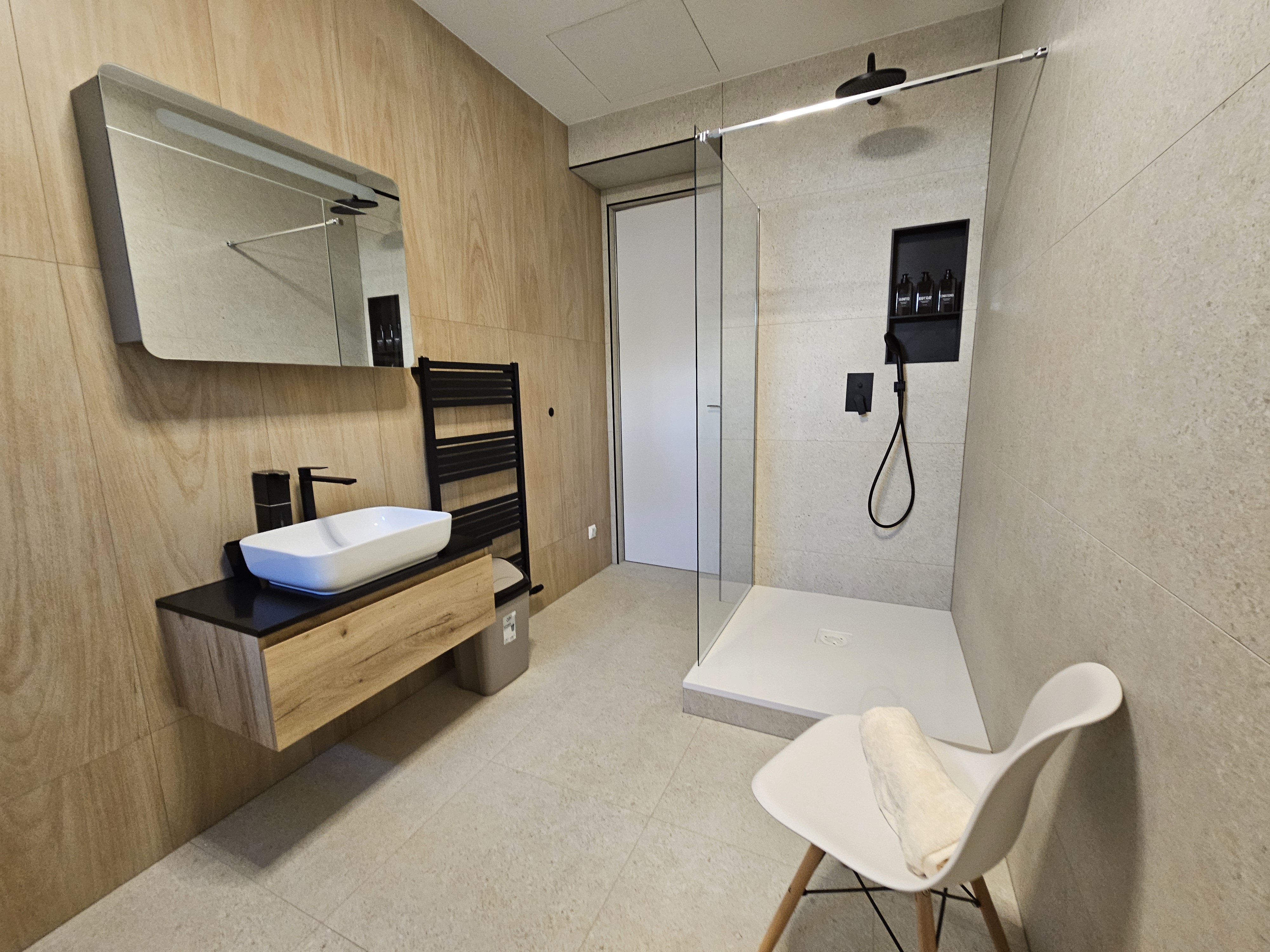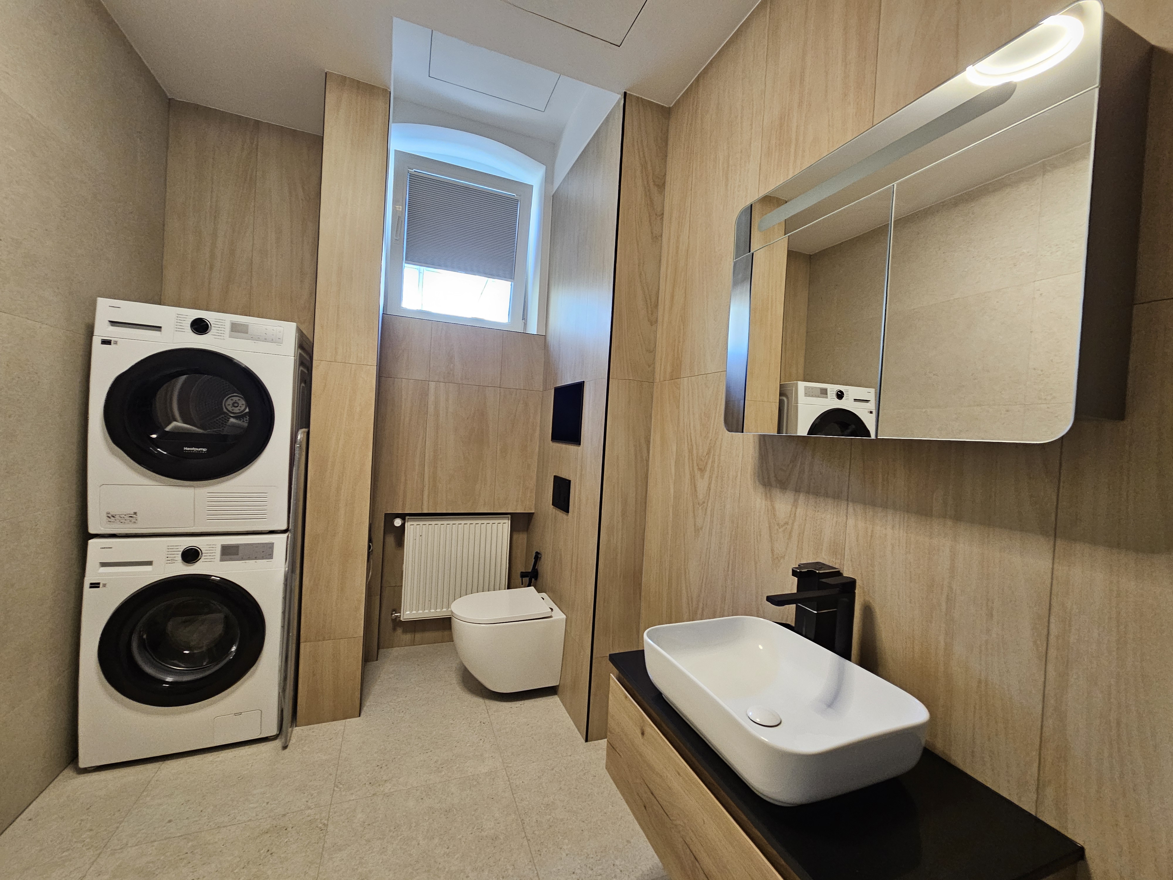 Veľká, svetlá kúpeľňa spojená s WC je zariadená sprchovým kútom, bidetovou sprchou a praktickou práčkou so sušičkou. Priestor je elegantný, vzdušný a pohodlný – ideálny pre relax po náročnom dni.
