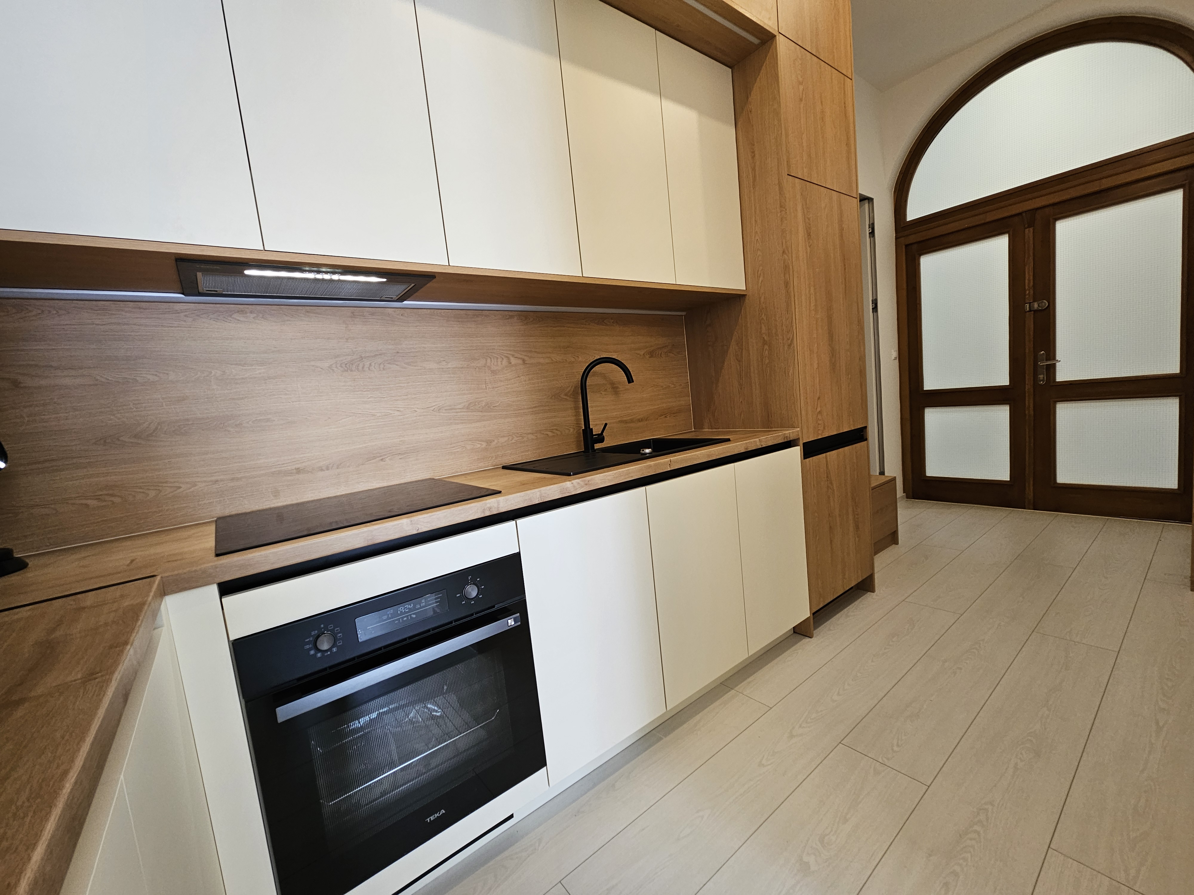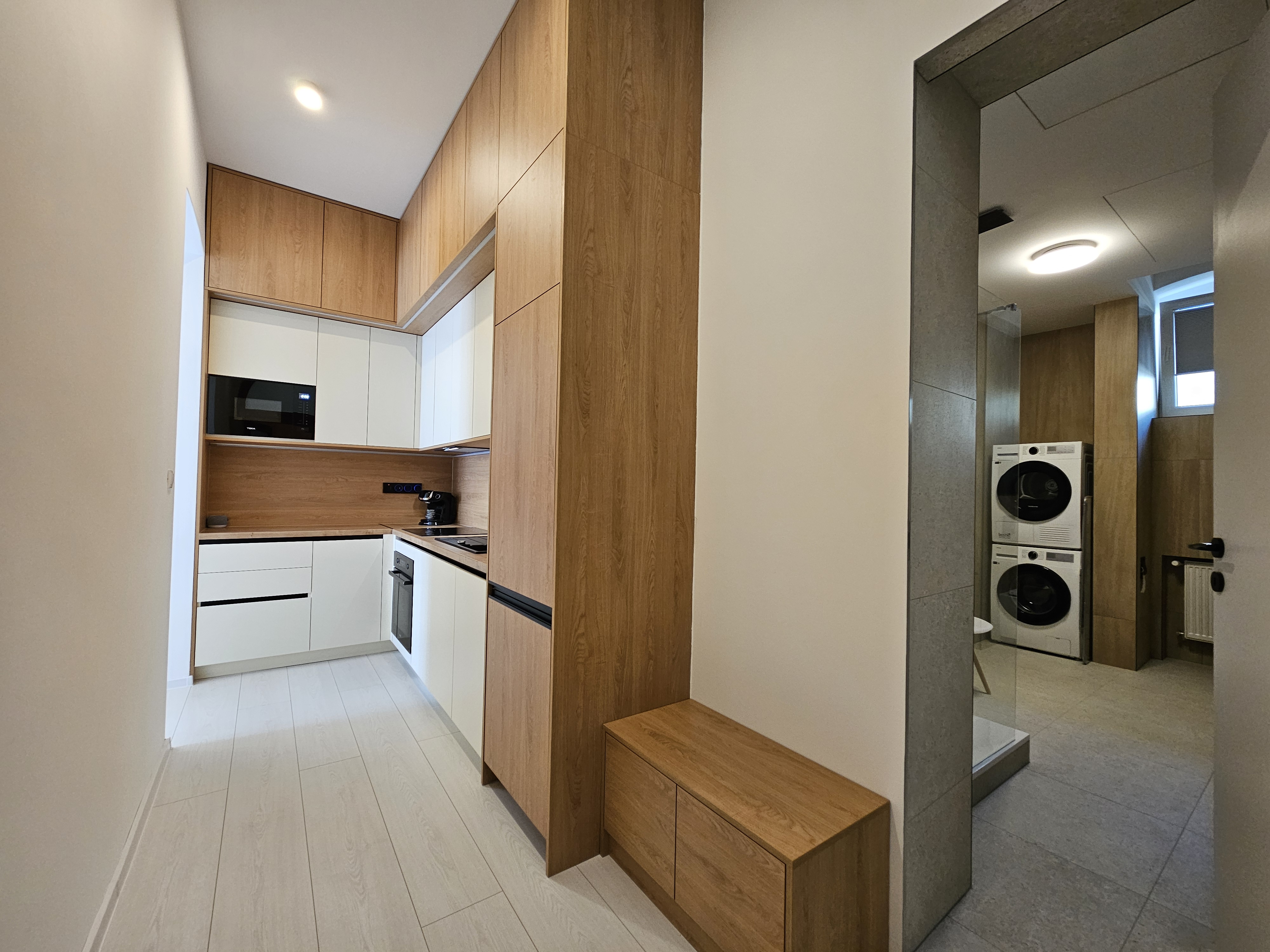 Dizajnová kuchynská linka s elegantným jedálenským stolom je vybavená spotrebičmi vyššej triedy značky TEKA – rúra, mikrovlnná rúra, varná doska, umývačka riadu a chladnička s mrazničkou. Perfektná pre gurmánov aj tých, ktorí milujú pohodlie domova.