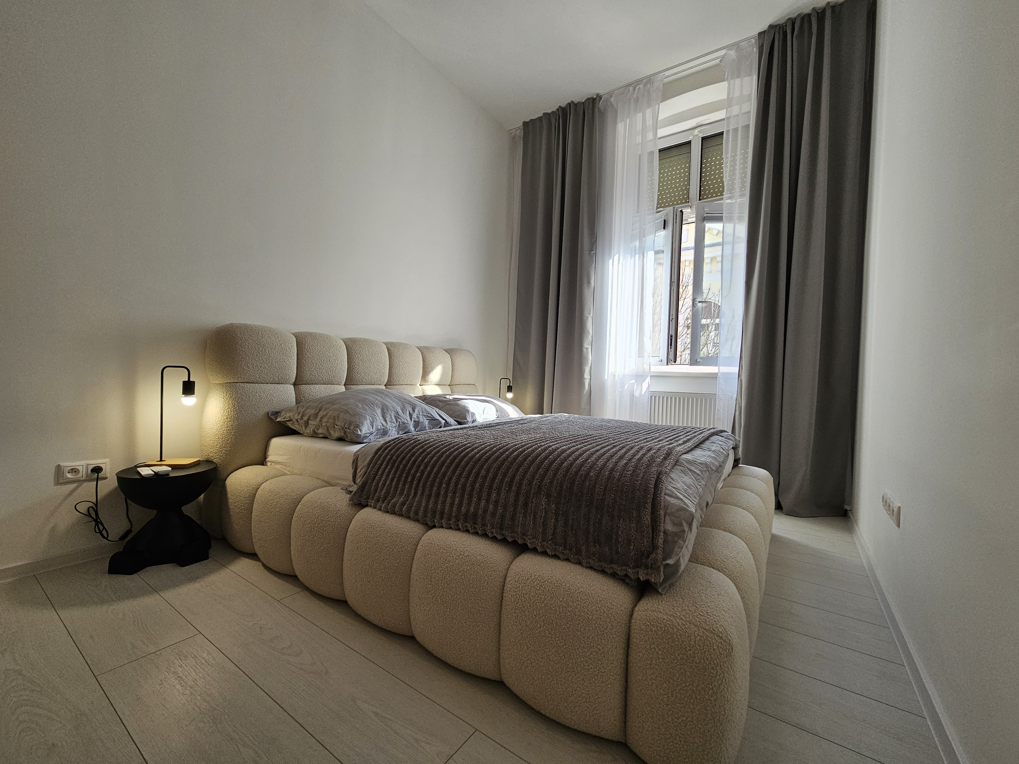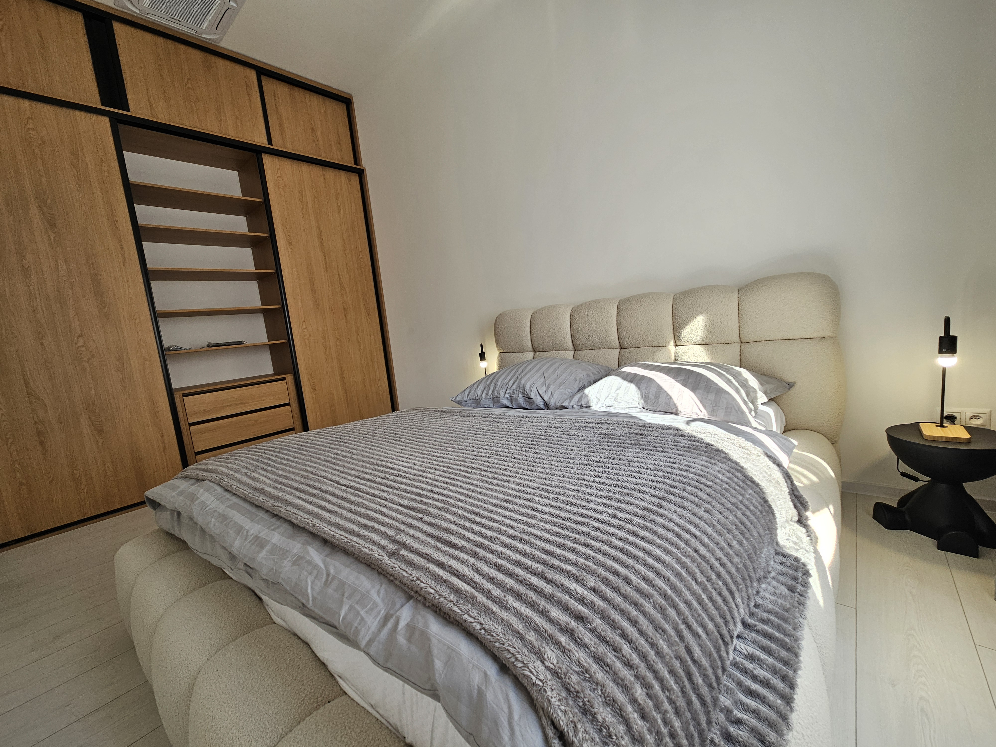 Priestranná spálňa ponúka manželskú posteľ, vstavanú skriňu a vlastnú klimatizáciu. Každé ráno sa tu prebúdza pokoj a harmonická atmosféra.