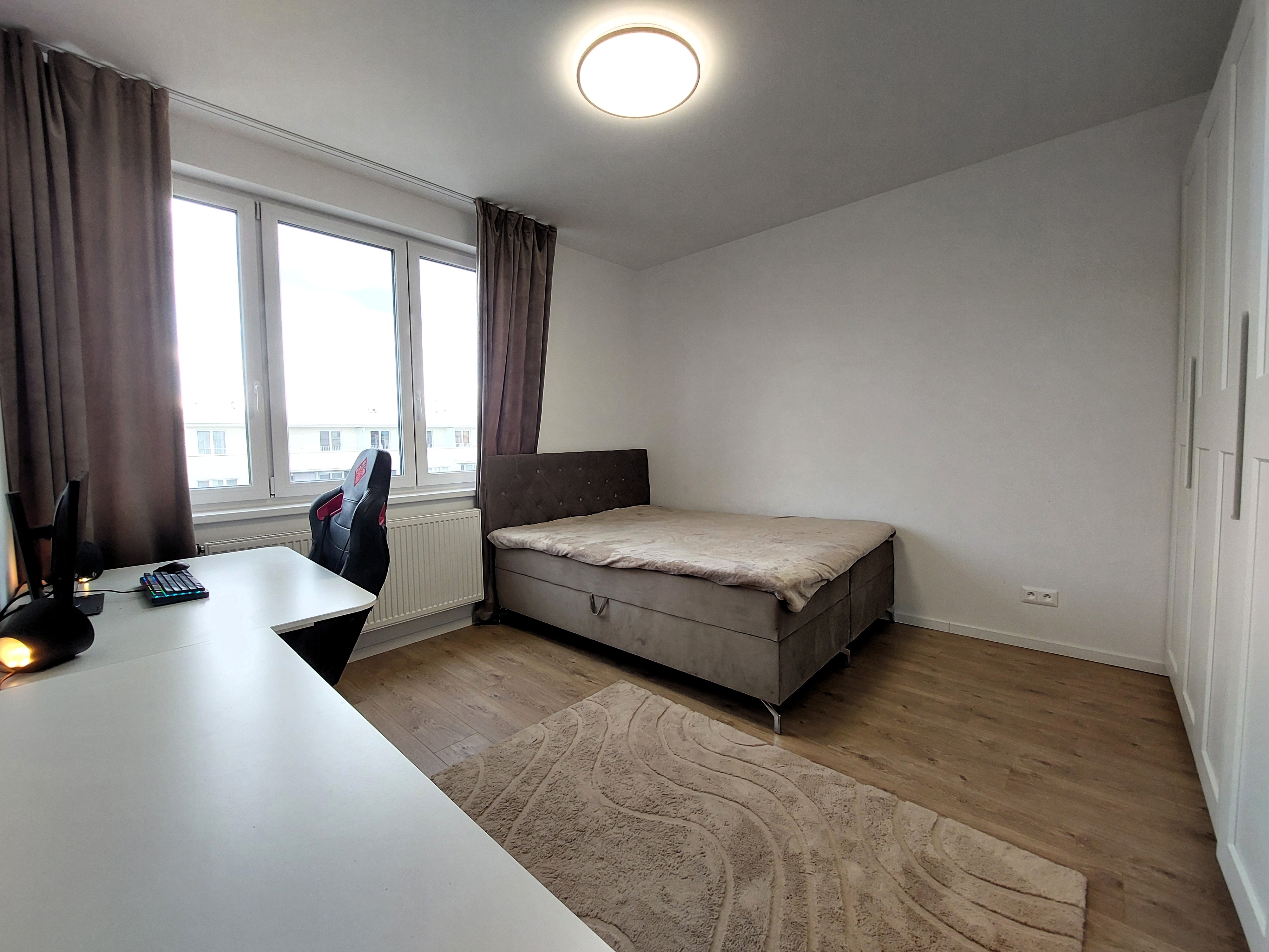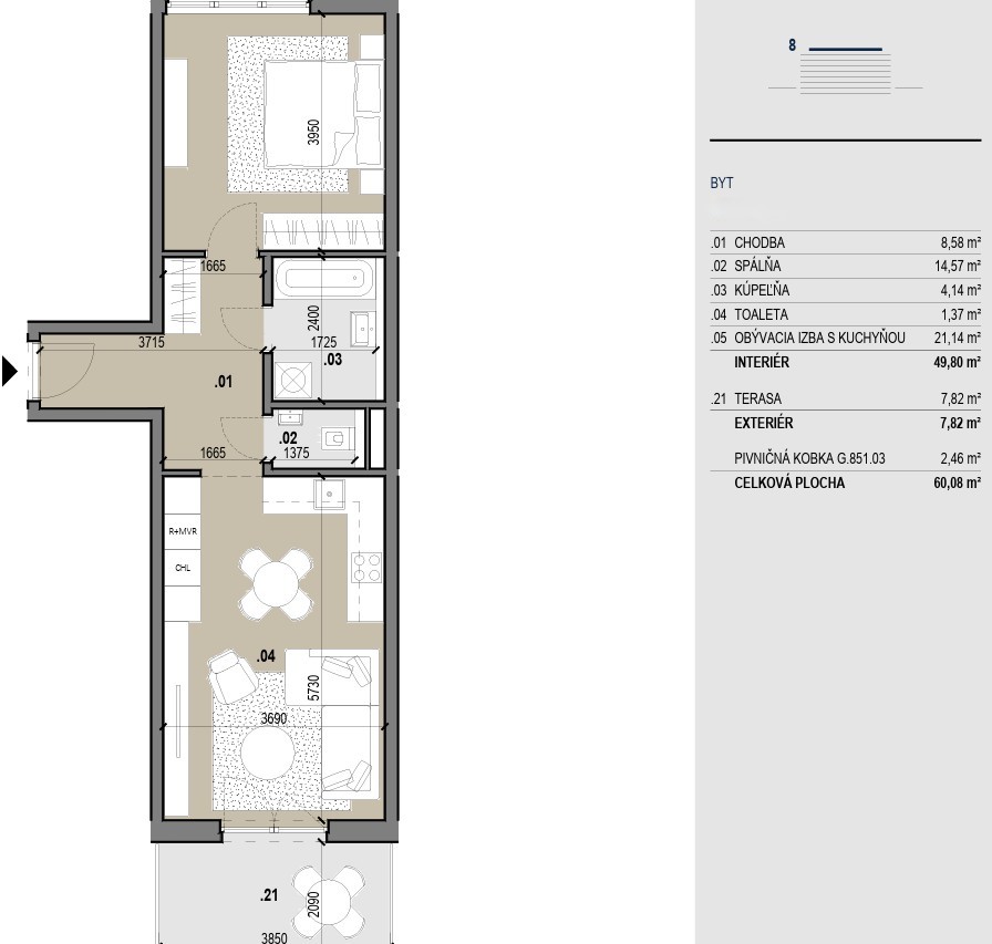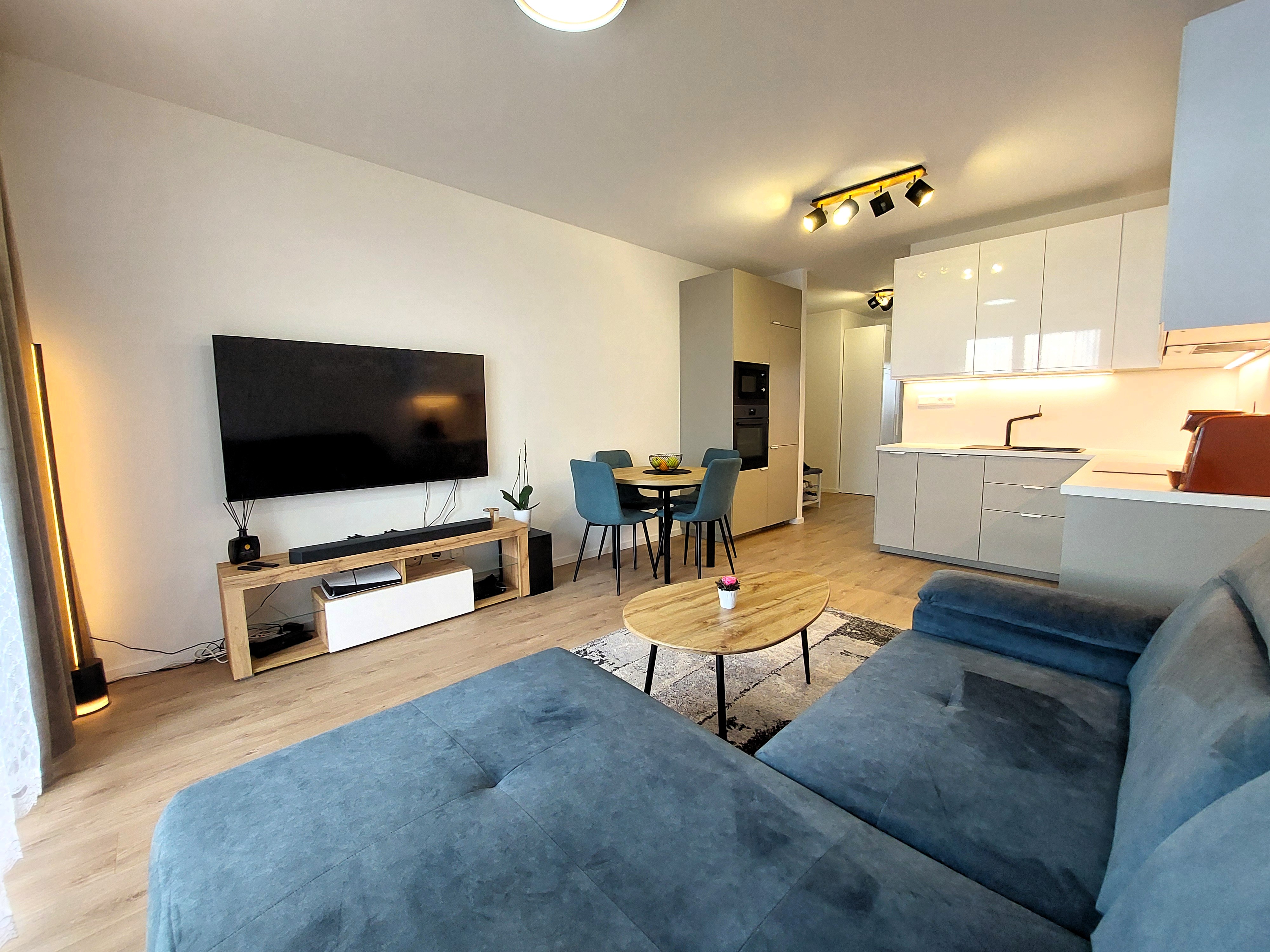 Pri vstupe nájdete odkladací priestor na šatsvo, botník a zrkadlo. Srdce domu tvorí otvorený koncept kuchyne prepojenej s obývačkou, ktorá je vybavená nábytkom na mieru, kvalitnými značkovými spotrebičmi, jedálenským setom, sedacou súpravou, konferečným stolíkom a TV nábytkom. Krytá terasa s osvetlením, elektrickou prípojkou a vývodom vody je dostupná z dennej časti. Spálňa so širokou manželskou posteľou, šatníkovou skriňou a nočnými stolíkmi je pripravená pre Vaše pohodlie. Kúpelňa s vaňou a umývadlovou skrinkou poskytuje dostatok priestoru, oceníte samostatne oddelenú toaletu s vetraním. Byt disponujúci výhľadmi na mesto a okolitú zeleň sa nachádza na 8. poschodí nového bytového domu s výťahom.