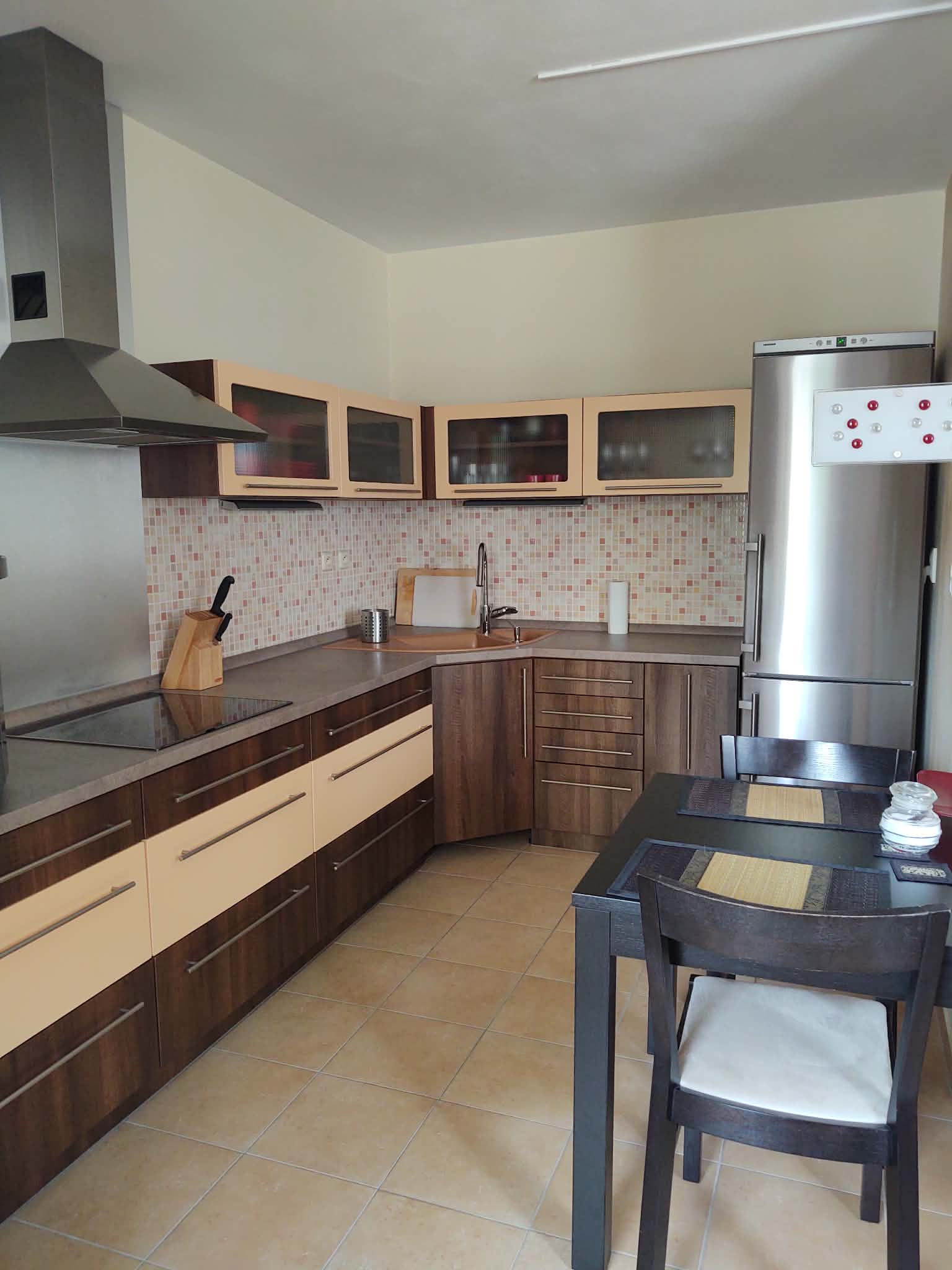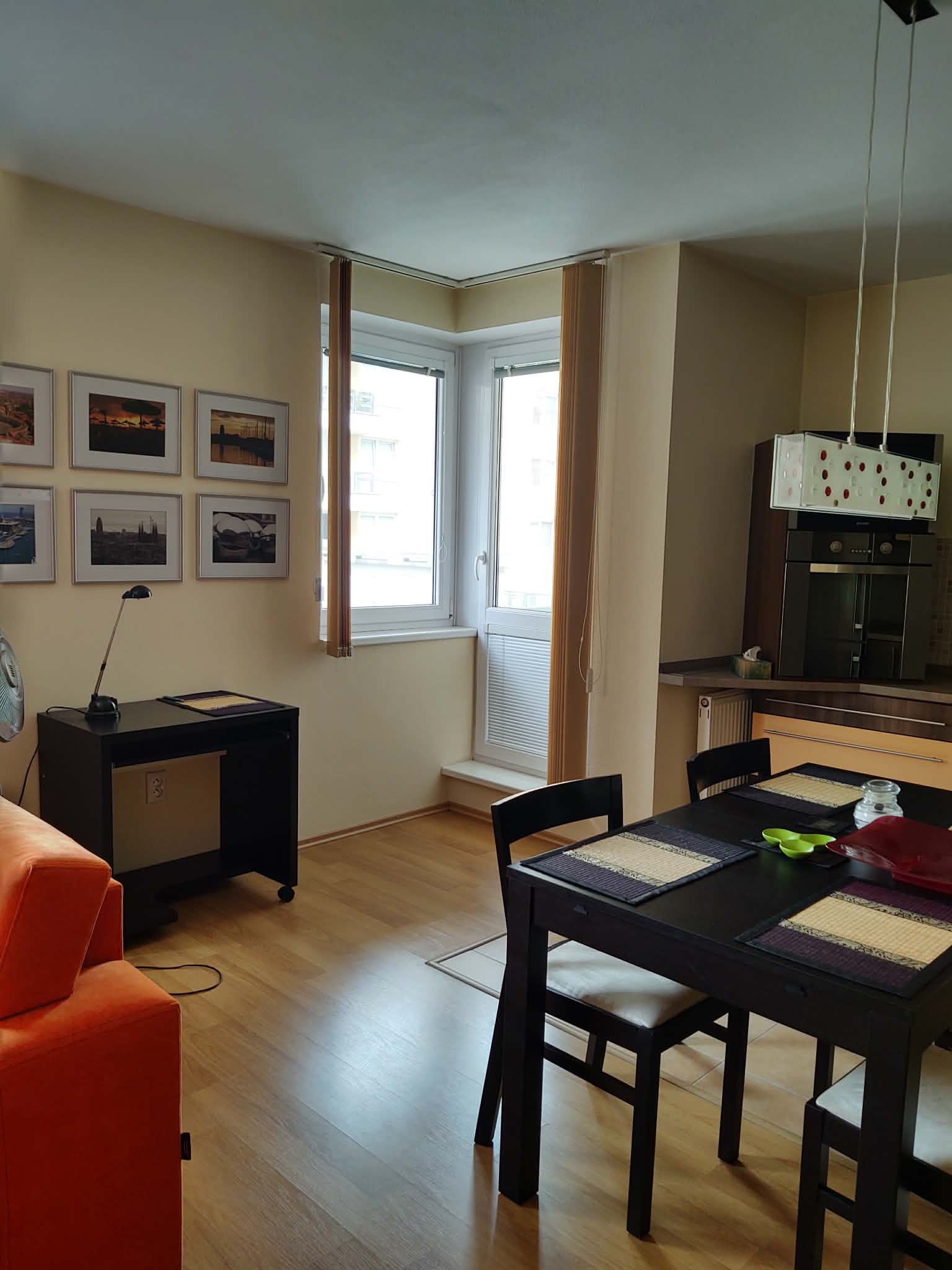 Dispozícia bytu je veľmi praktická. Po vstupe sa nachádza priestranná chodba s veľkou vstavanou skriňou, ktorá poskytuje dostatok úložného priestoru. Z chodby je vstup do kúpeľne s vaňou a toaletou. Hlavnú časť bytu tvorí veľká obytná miestnosť prepojená s kuchynskou časťou a jedálenským stolom, ktorá ponúka dostatok priestoru na vytvorenie samostatnej obývacej a spálňovej časti. Z bytu je zároveň prístup na lodžiu, ktorá ponúka príjemný výhľad do vnútrobloku. Mesačné náklady sú 110 Eur (správcovský poplatok, elektrika, interner).