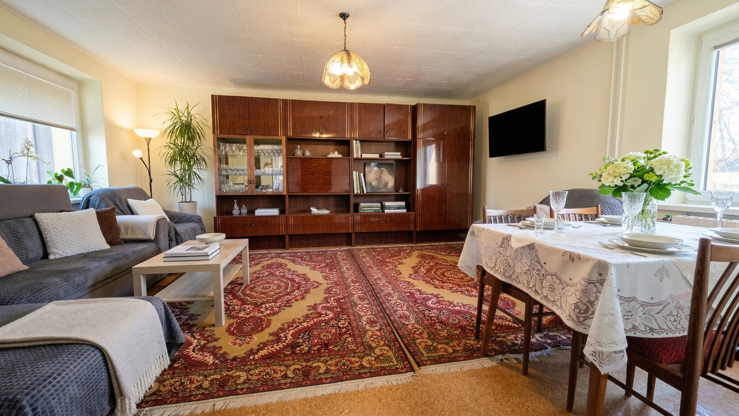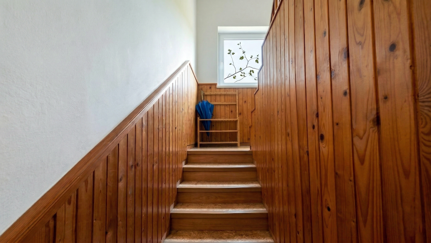 Masívny nábytok v tradičnom štýle, drevené schodisko s vyrezávanými prvkami a celoplošným dreveným obkladom, plastové okná so žalúziami a sieťami proti hmyzu. Vykurovanie kombinované.