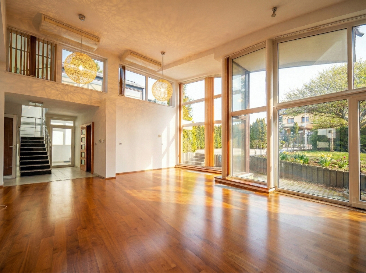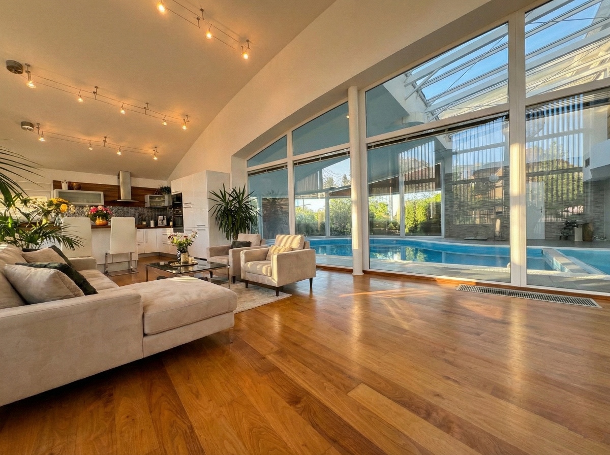 Predstavte si: ráno v bazéne, káva v zimnej záhrade zaliatej svetlom, večer v saune... a to všetko doma. Prístavba z roku 2016 s veľkoformátovým presklením a oblúkovou strešnou konštrukciou stiera hranicu medzi interiérom a exteriérom. Denná zóna, wellness, terasy, balkóny. Dom, v ktorom sa vám dobre žije.