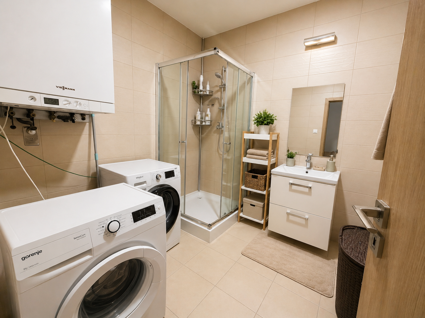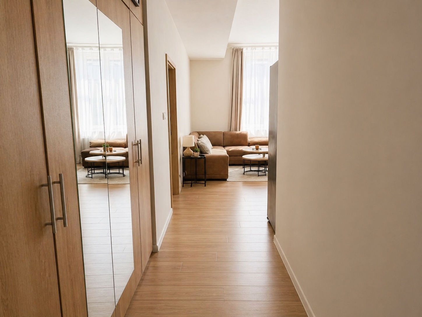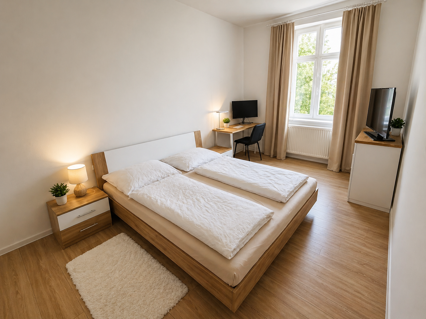 Dispozične byt ponúka priestrannú obývaciu izbu prepojenú s plne vybavenou kuchyňou a jedálenským kútom, ktorá prirodzene tvorí srdce celého bytu. Obývacia časť poskytuje dostatok priestoru na oddych aj každodenný komfort. Samostatná spálňa je zariadená manželskou posteľou a pracovným kútom, pričom vďaka veľkým oknám je krásne presvetlená. Kúpeľňa disponuje sprchovacím kútom, umývadlom a práčkou, pričom veľkou výhodou je aj samostatné WC. Vstupná chodba ponúka praktický úložný priestor.