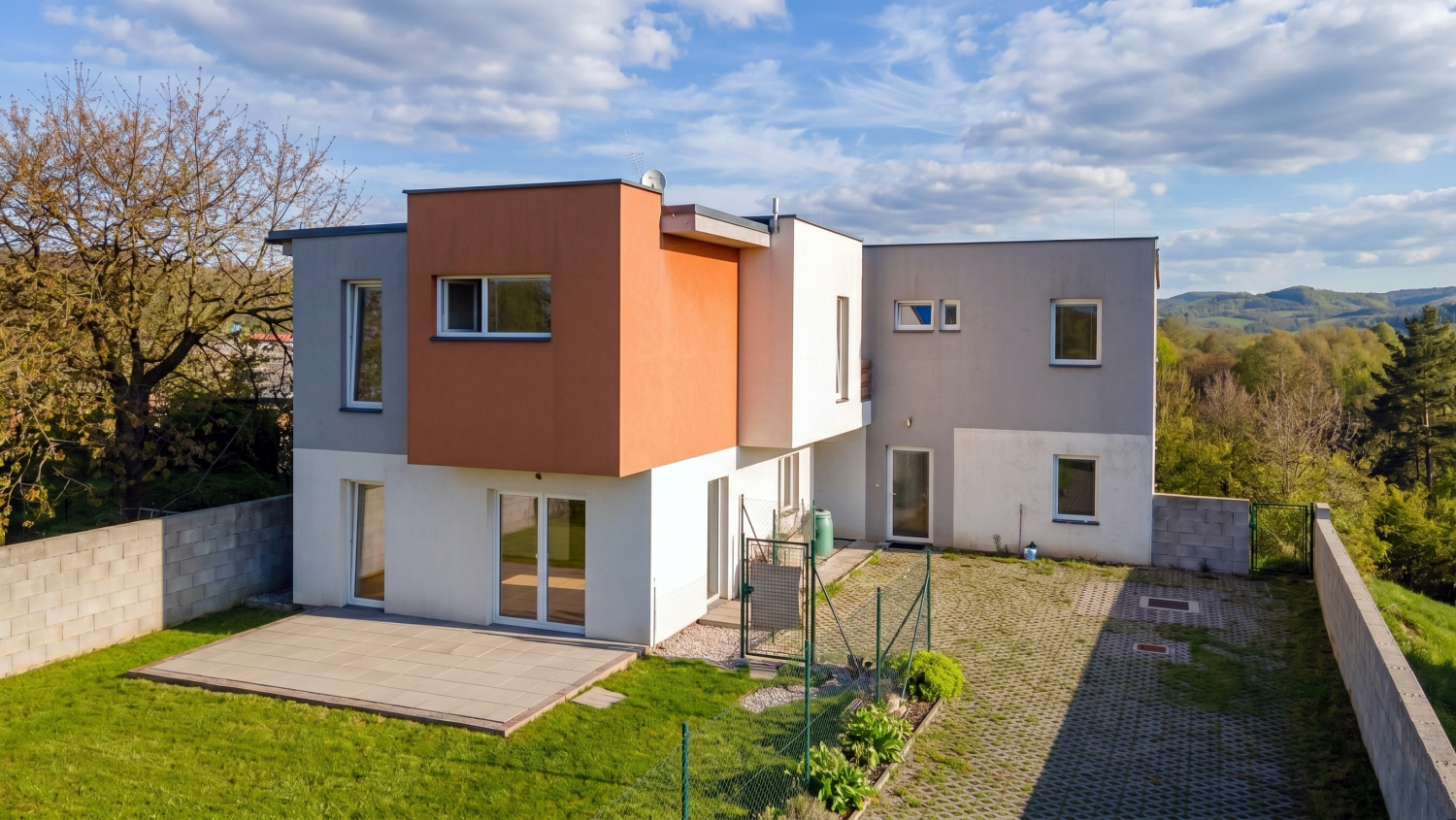 Pretože: kombinácia 108,5 m² obytnej plochy + dve viacúrovňové terasy + 350 m² pozemok s výhľadmi do okolia. Krajný dom modernej trojradovky z roku 2020.