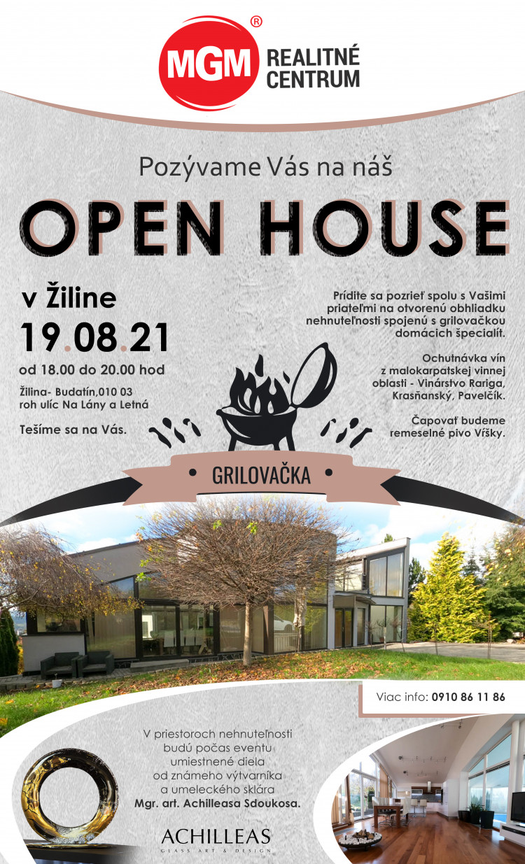 Počas tohto eventu bude k dispozícii viacero realitných expertov, ktorí Vás vedia previesť celým rodinným domom a odprezentovať jeho benefity. Počas obhliadky sa budú na otvorenom ohni grilovať domáce špeciality a čapovať budeme remeselné pivo Vŕšky. Ulahodíme aj milovníkom vín ochutnávkou z malokarpatskej vinnej oblasti. Okrem iného budú v priestoroch nehnuteľnosti počas eventu umiestnené diela od známeho výtvarníka a umeleckého sklára Mgr. art. Achilleasa Sdoukosa, ktorý nás navyše poctí svojou prítomnosťou.